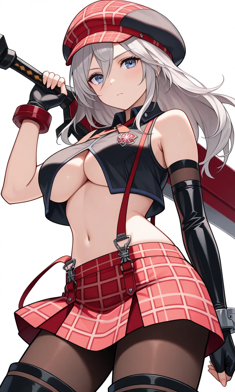 alisaGE1,grey hair, long hair,thighhighs, hat, navel, pantyhose, black gloves, elbow gloves, midriff, fingerless gloves,black vest, underboob, red skirt,plaid skirt, red headwear, suspender skirt, cabbie hat, plaid headwear,