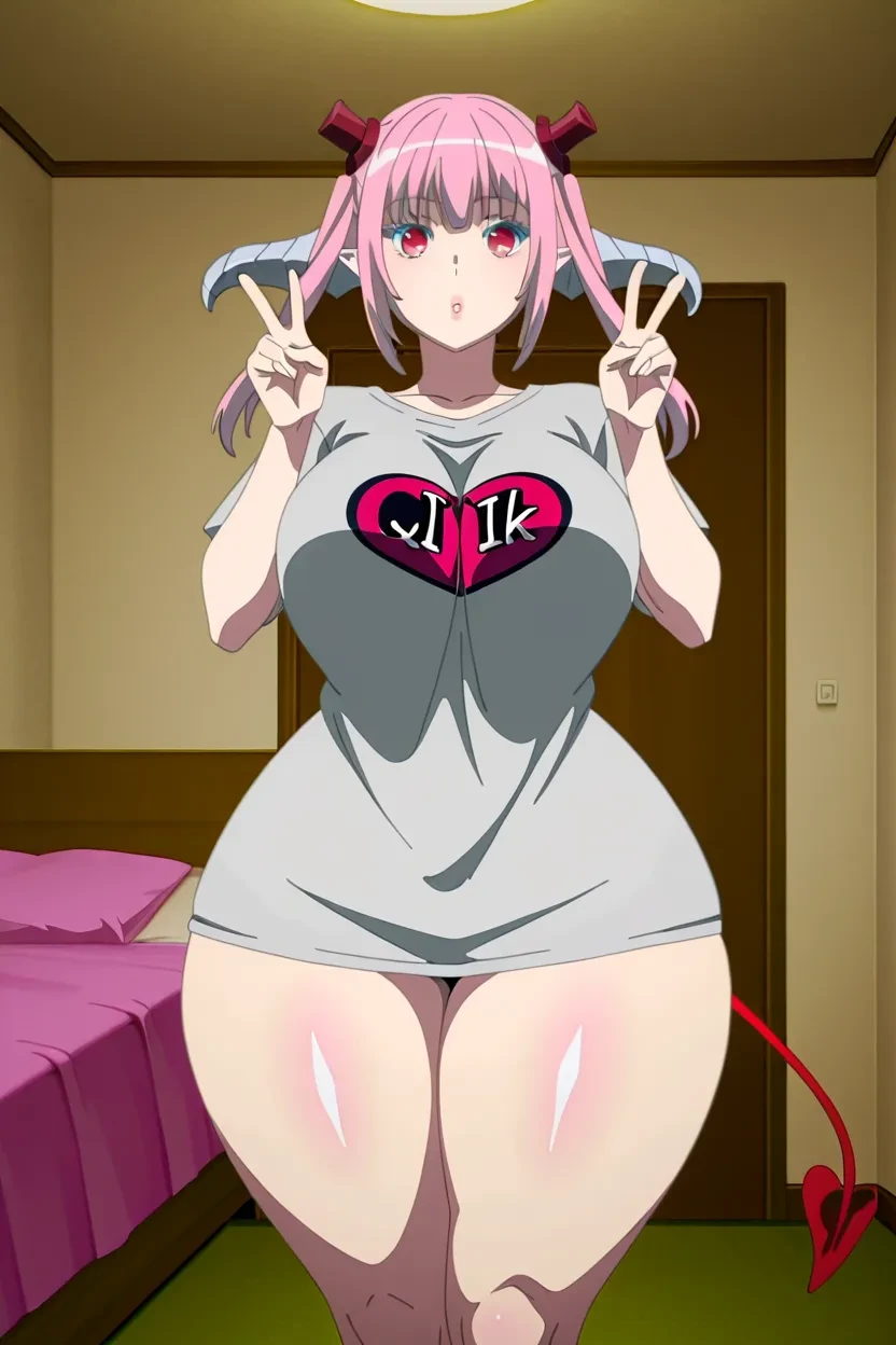 1girl, Astaroth (Seven Mortal Sins), red_eyes, pink_hair, long_hair, twin_tails, horns, lips, thick lips, glossy lips, huge_breasts, curvy, sexy, wide hips, thick thighs, t-shirt, baggy t-shirt,