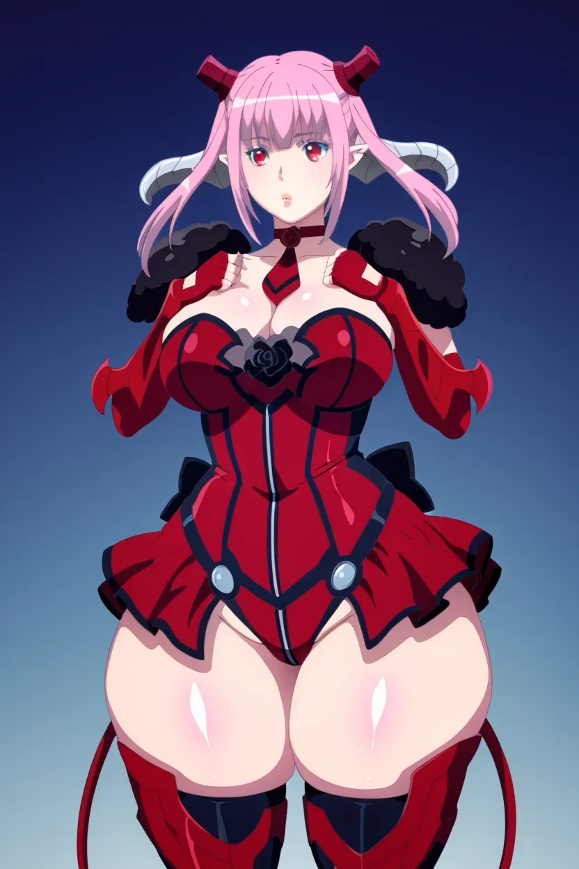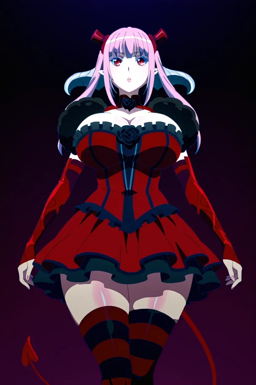 1girl, Astaroth (Seven Mortal Sins), red_eyes, pink_hair, long_hair, twin_tails, horns, lips, thick lips, glossy lips, huge_breasts, curvy, sexy, wide hips, thick thighs, emo dress, emo fashion, stripped thigh highs