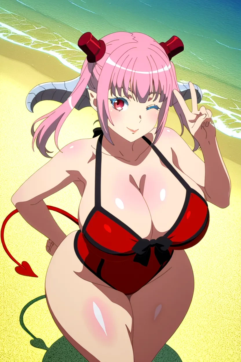 1girl, Astaroth (Seven Mortal Sins), red_eyes, pink_hair, long_hair, twin_tails, horns, lips, thick lips, glossy lips, huge_breasts, curvy, sexy, wide hips, thick thighs, swim suit, bikini