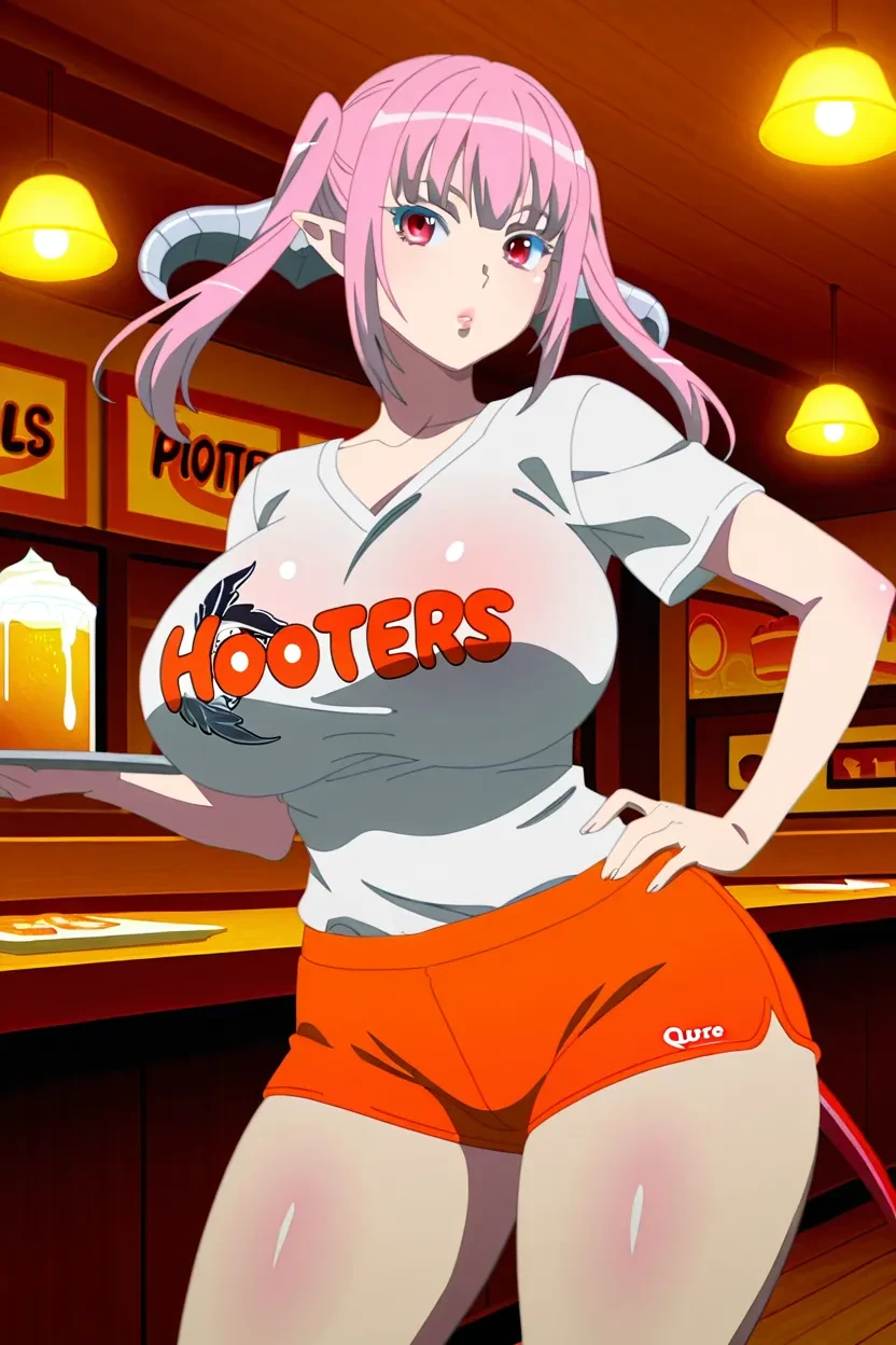 1girl, Astaroth (Seven Mortal Sins), red_eyes, pink_hair, long_hair, twin_tails, horns, lips, thick lips, glossy lips, huge_breasts, curvy, sexy, wide hips, thick thighs, hooters uniform,