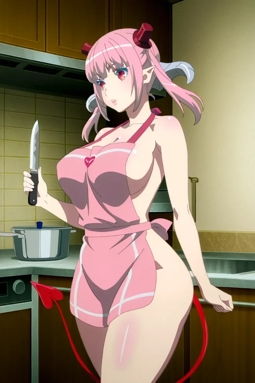 1girl, Astaroth (Seven Mortal Sins), red_eyes, pink_hair, long_hair, twin_tails, horns, lips, thick lips, glossy lips, huge_breasts, curvy, sexy, wide hips, thick thighs, makeup dress, slit dress, silk white dress, thigh strap, panties,
