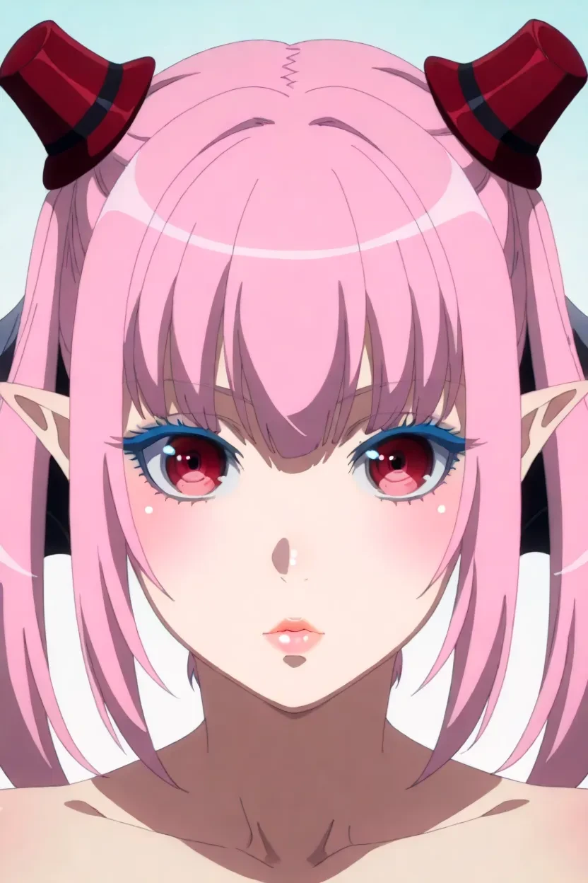 1girl, Astaroth (Seven Mortal Sins), red_eyes, pink_hair, long _hair, twin_tails, horns, lips, thick lips, glossy lips, huge_breasts, Seven_Mortal_Sins_art_style, HD, 4k, high-resolution, superb_qualty
