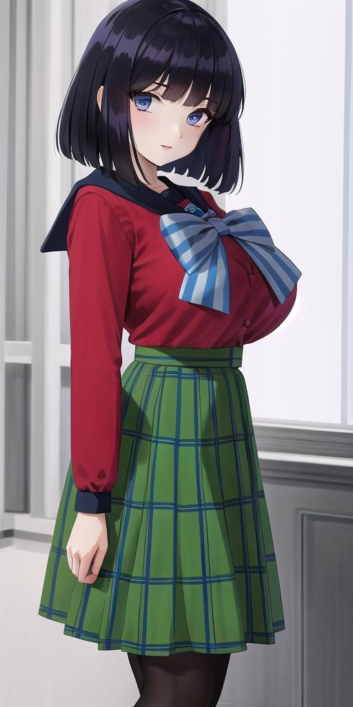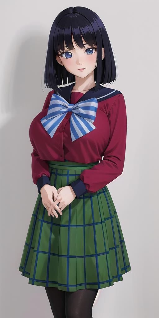 Mugen_School_Uniform_Black_sailor_collar_Red_shirt_Green_skirt_Black_pantyhose_Blue_striped_bowtie: He unifrom from Mugen Gakuen