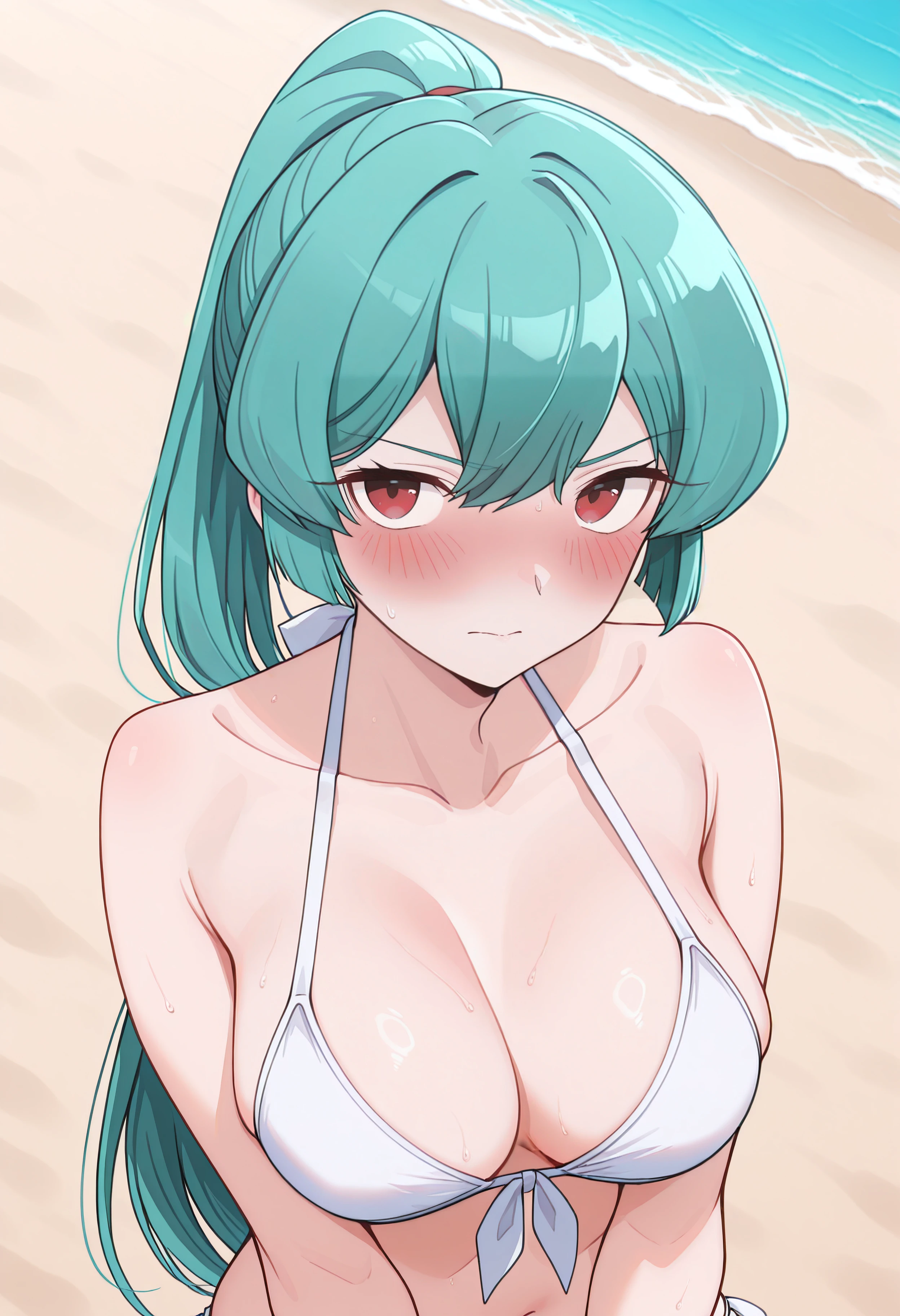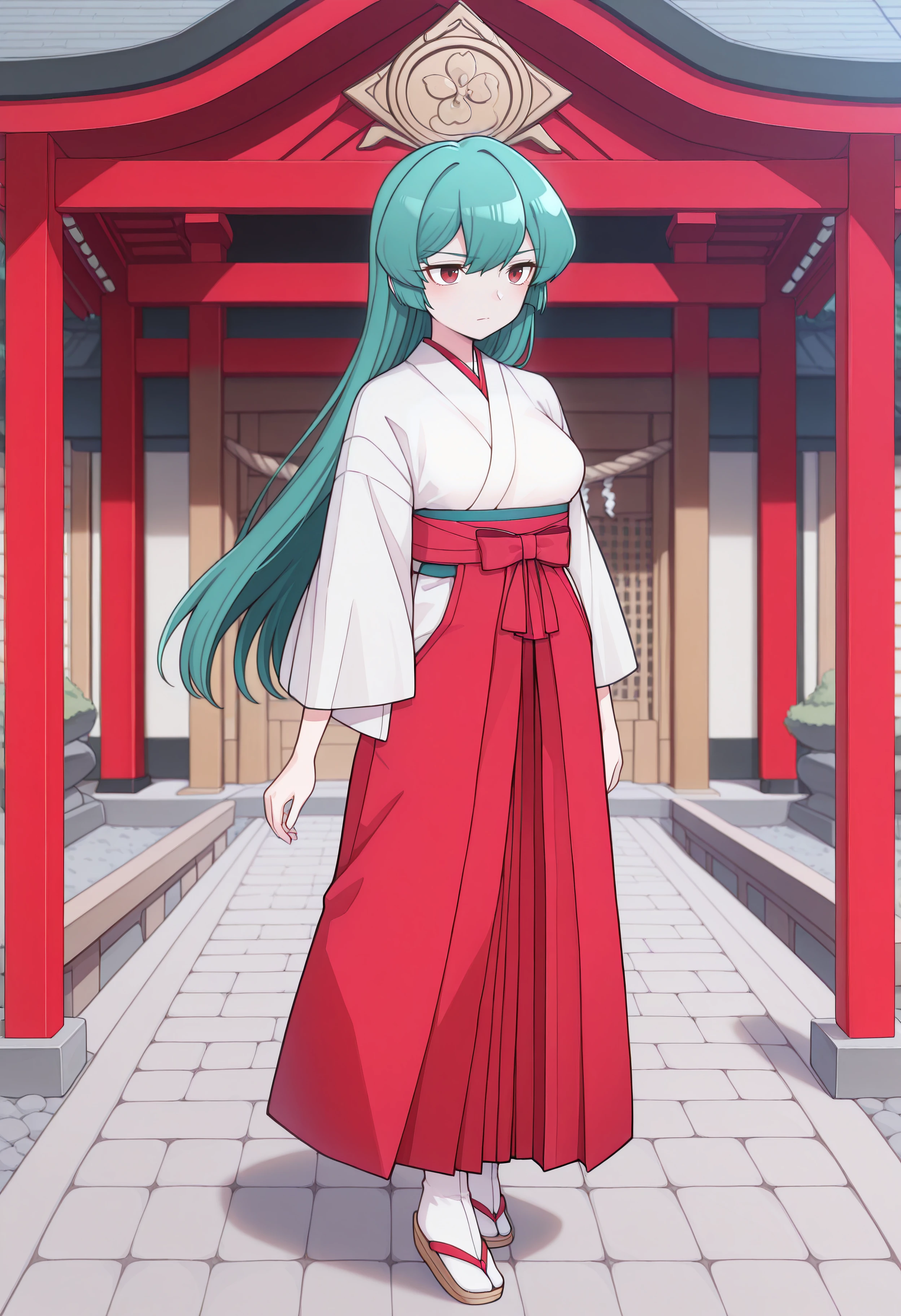 minakami sayo, green hair, long hair, red eyes, Magia Azul outfit :