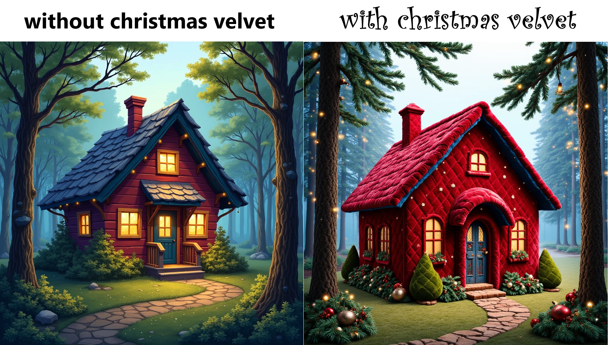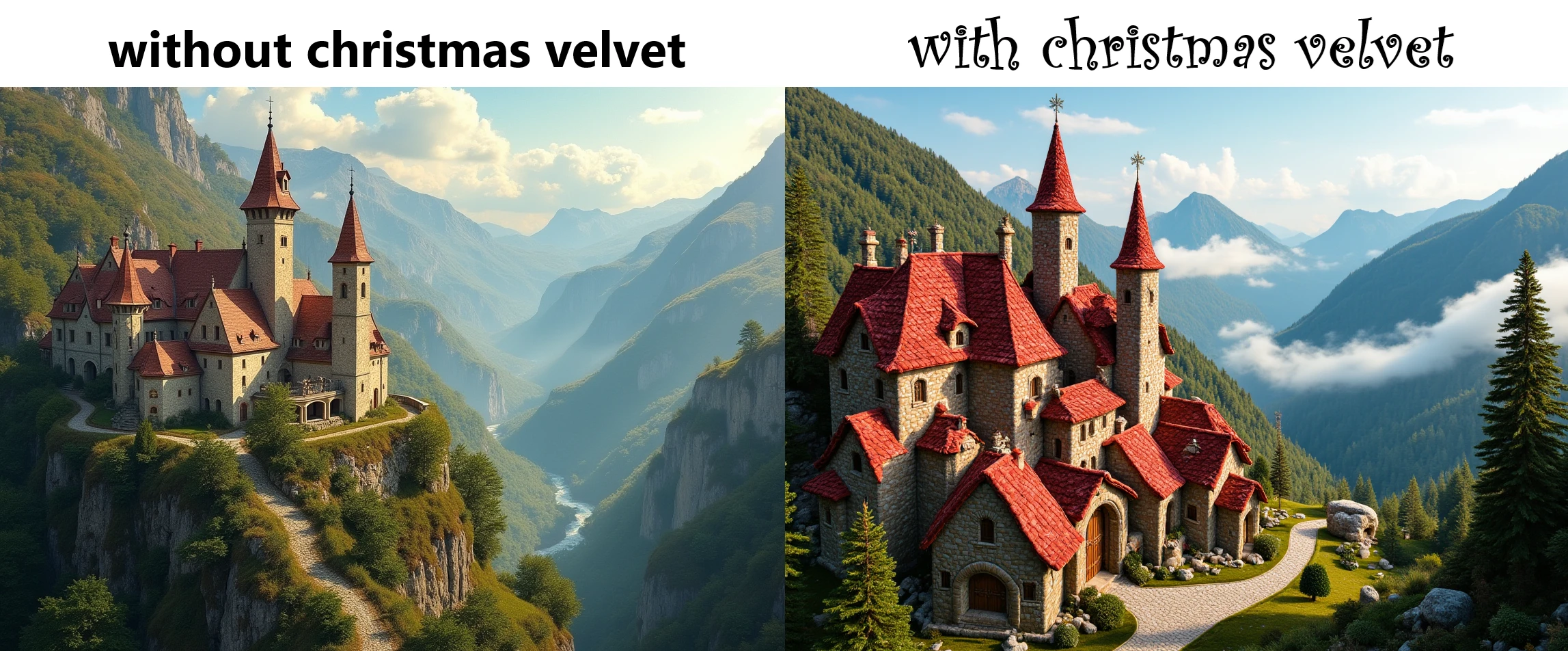 this LORA is designed to generate images featuring soft velvet textures, plush elements, winterly ornamets and a festive Christmas ambiance. Works great with everything red and black, winter and snow, fabric material, soft surface, Christmas and holiday season. Perfect for bringing warmth and elegance to your designs.