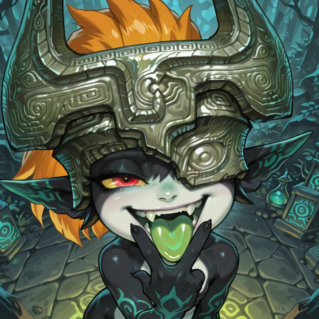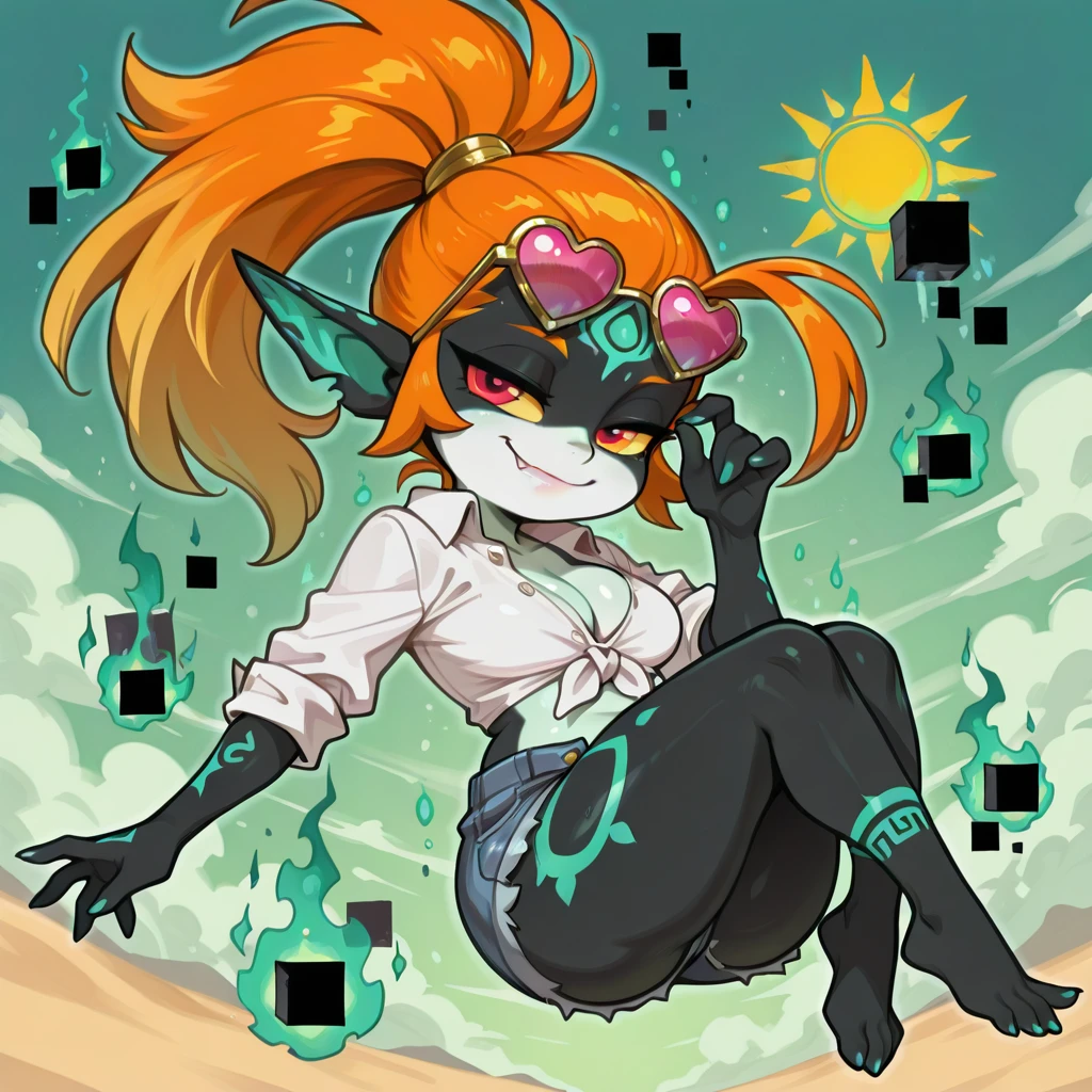 imp female, solo, curvy, wide , two-tone skin, black and white skin with green accents, multicolored skin, orange to yellow gradient hair, yellow sclera, red eyes, extravagant stone headdress over one eye, green markings on body, long pointed ears,