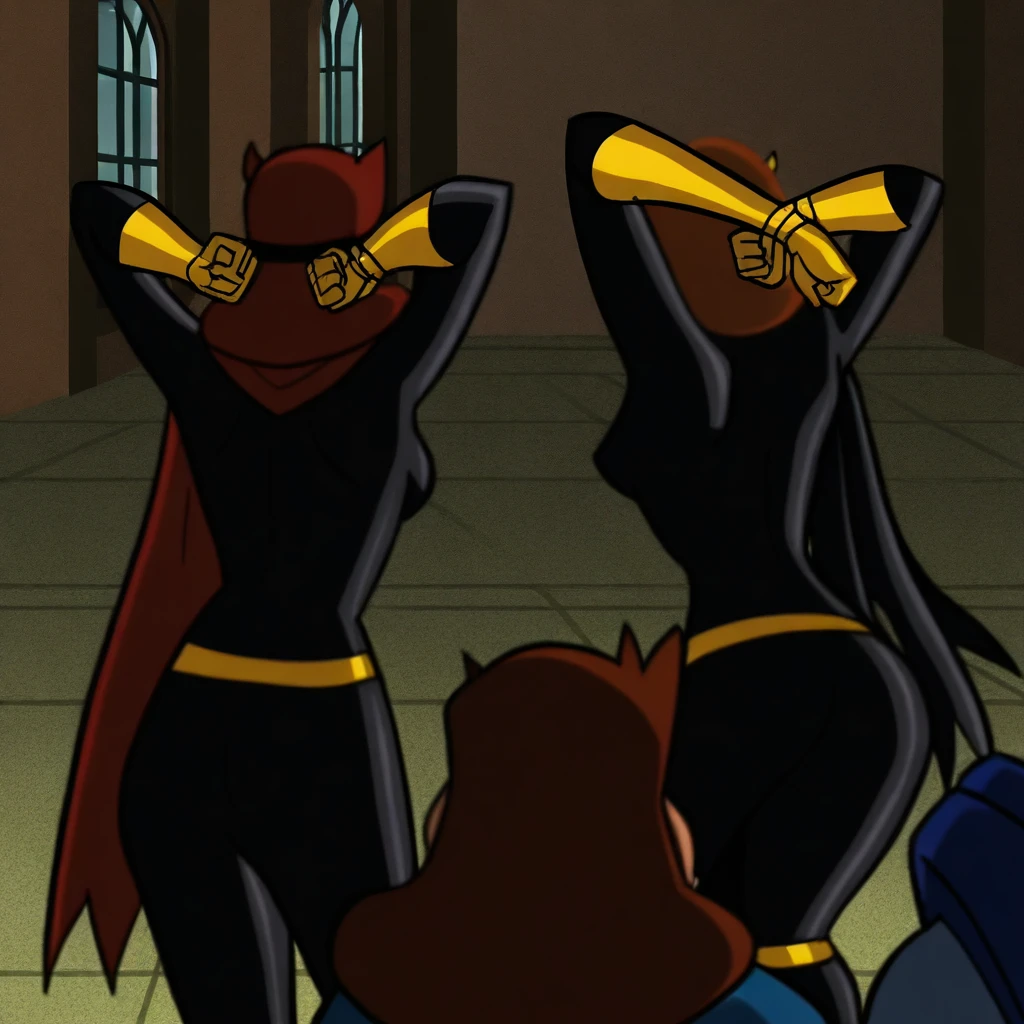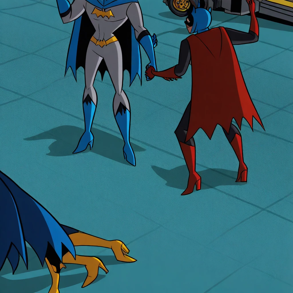 blue helmet, bat ears, black domino mask, blue cape, black , gold gloves, gold belt, bat logo,