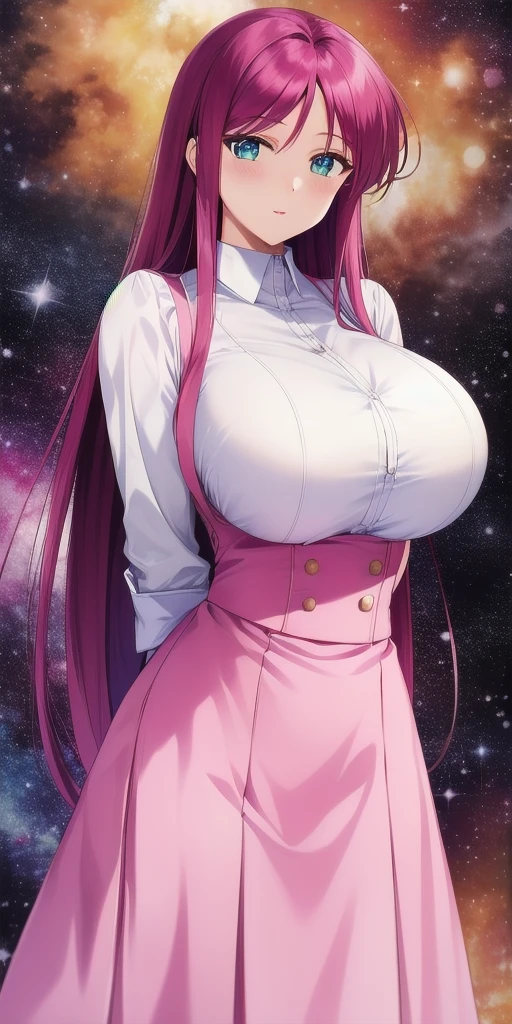 Waitress uniform with her secondary trigger(natsume_atsuko_braided_bangs_bun_cover_double_bun):white_shirt, pink_skirt, suspender_skirt, waitress