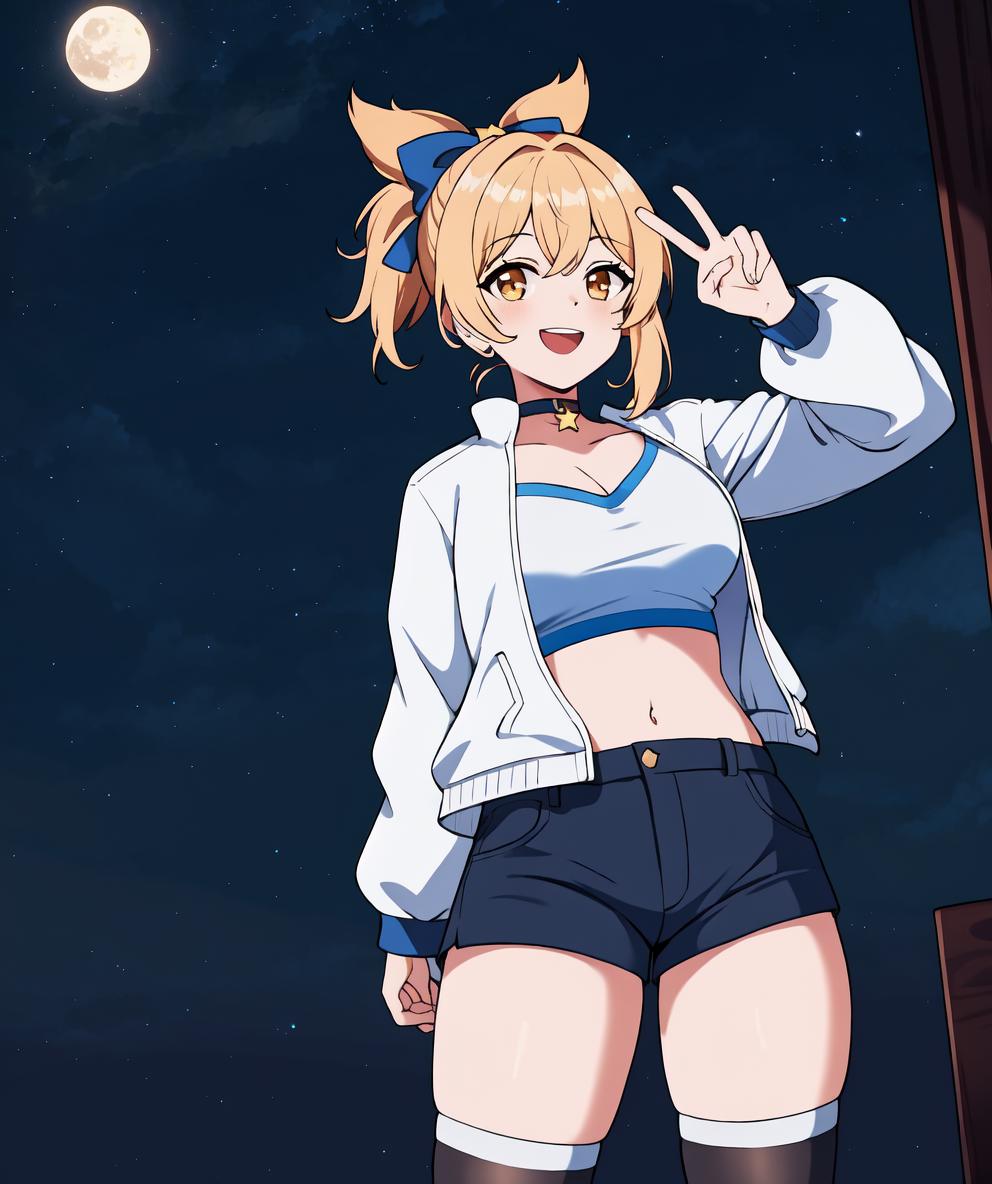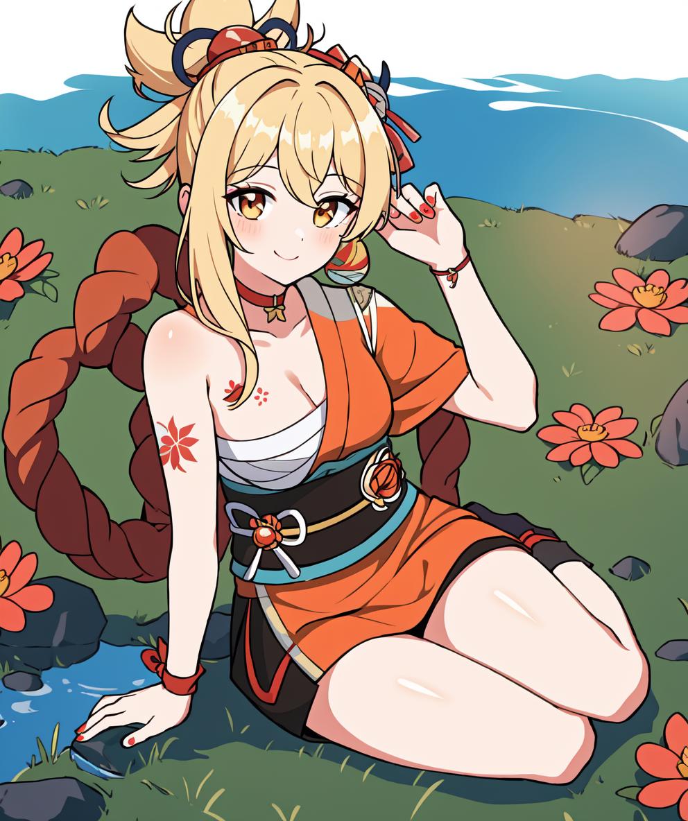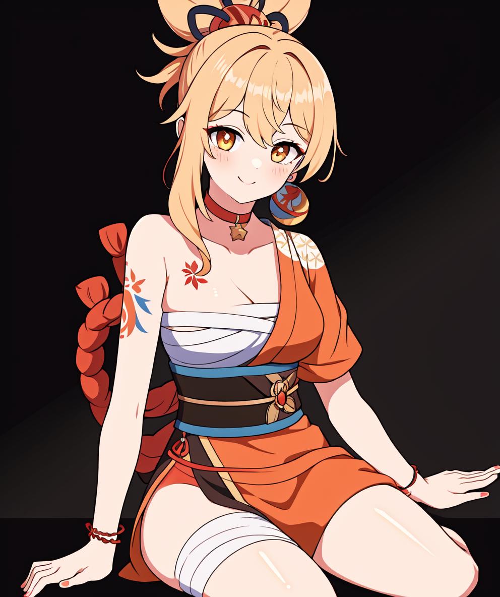 Recommended prompts if you want to more close to original character: yoimiya(genshin impact), 1girl, solo, blonde hair, ponytail, orange eyes, shimenawa, kimono, bandaged leg, tattoo, fingerless glove, hair between eyes, bandages, choker, sash, bracelet, orange kimono, bandaged arm, medium breasts, sarashi, japanese clothes, obi, arm tattoo, jewelry, hair ornament, bare shoulder, rope, (((bare arm))), (arm bandages), arm tattoo, chest bandages, black glove, one glove