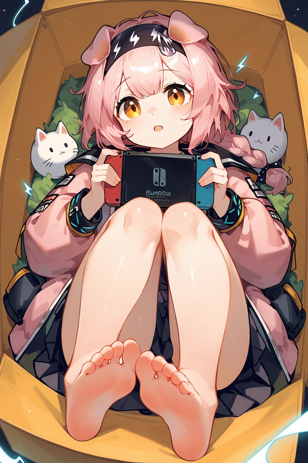 goldenglow (arknights),1girl,solo,cat ears,animal ears,yellow eyes,garter straps,thighhighs,long hair,white thighhighs,braid,black skirt,pink hair,hairband,tail,cat tail,long sleeves,pink coat,jacket,pink jacket,bow,blue bow,looking at viewer,black hairband,cat girl,bangs,shirt,floppy ears,open clothes,open jacket,hair between eyes,white shirt,