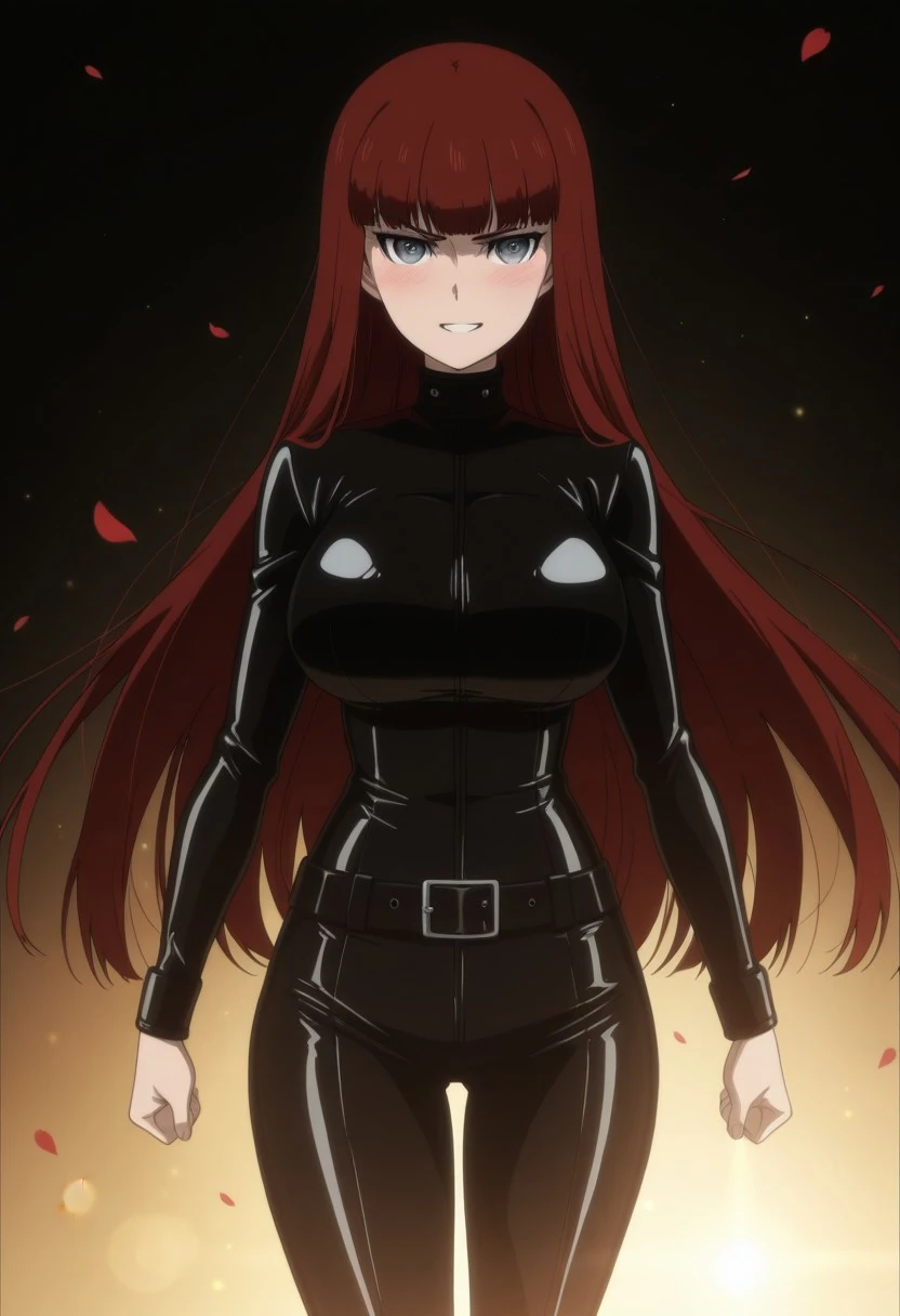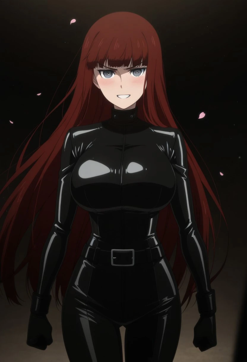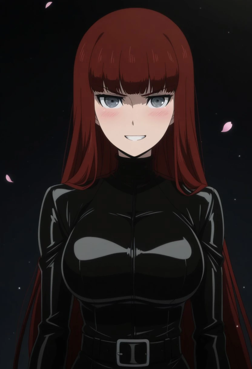 red hair, long hair, blunt bangs, grey eyes, detailed eyes