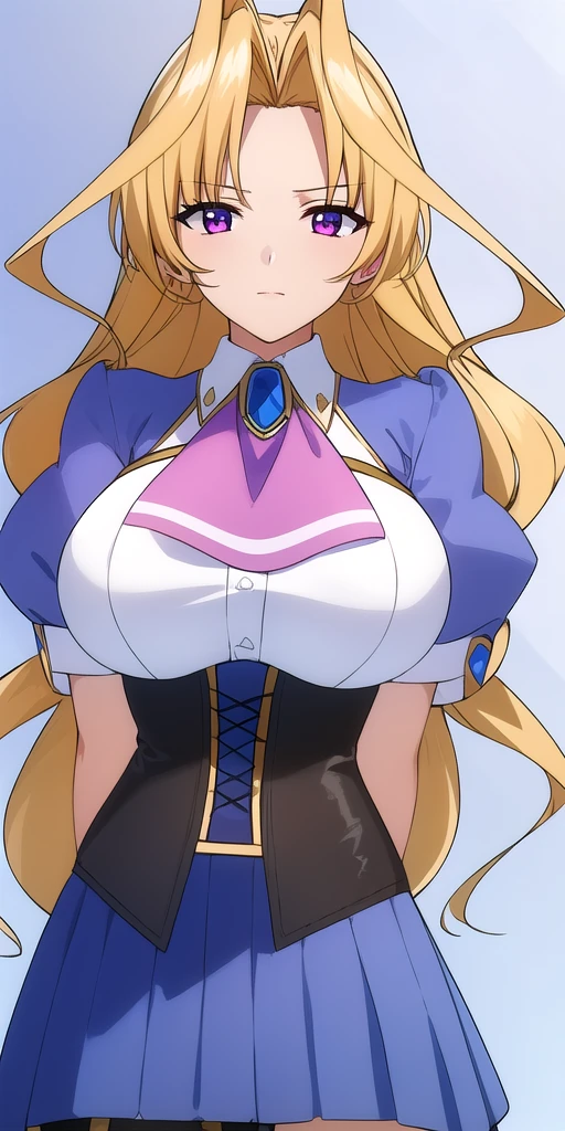 white_shirt_blue_puffy_short_sleeves_pink_ascot_blue_brooch_black_corset_blue_pleated_skirt_garter_straps_thigh_strap_black_thighhighs