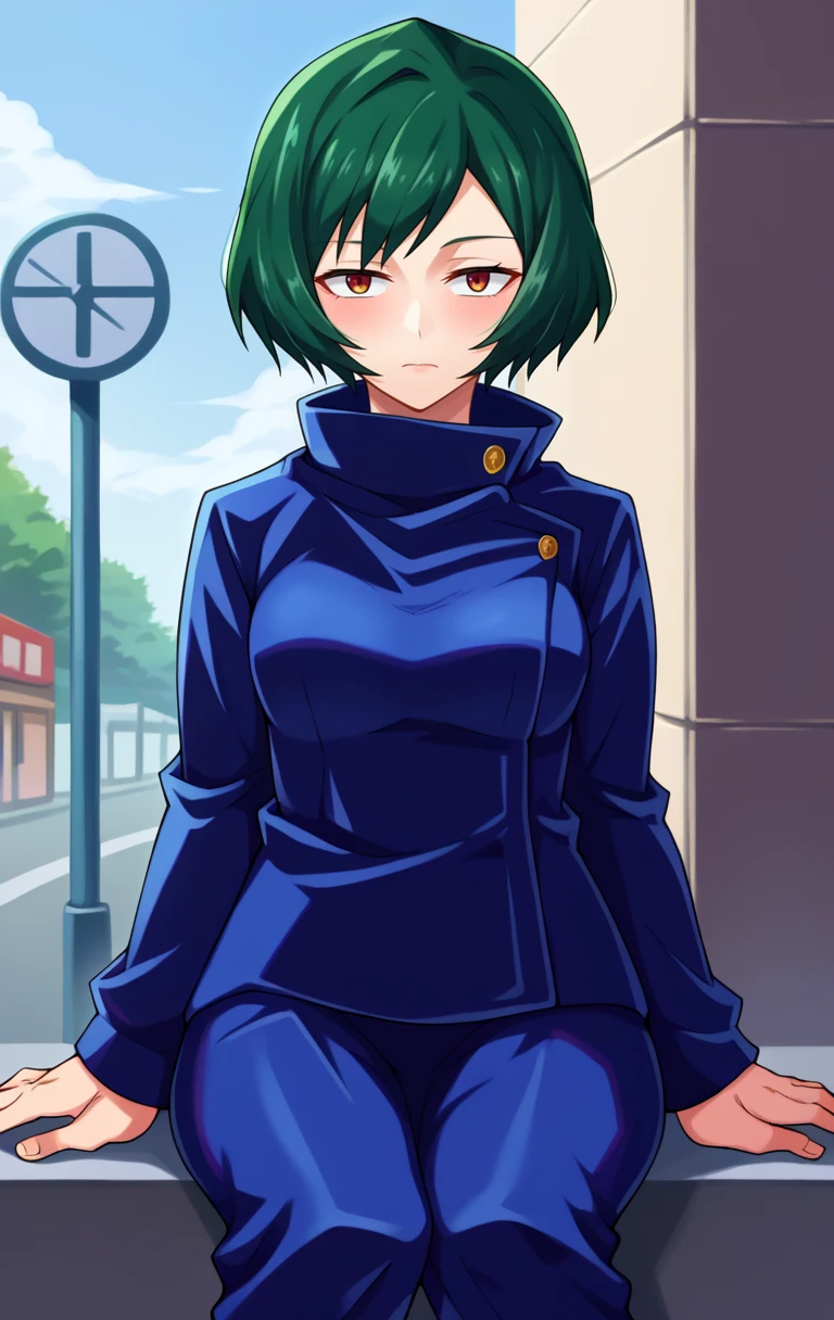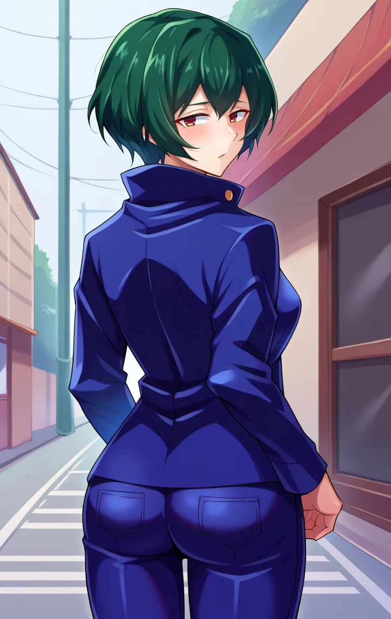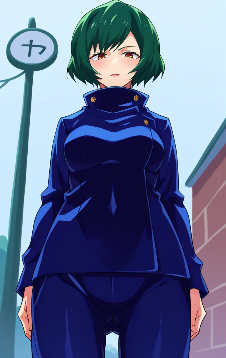 MaiZeninSDXL,1girl,solo,short hair,brown eyes,school uniform,high collar,gakuran,green hair,pants,