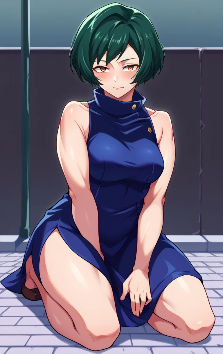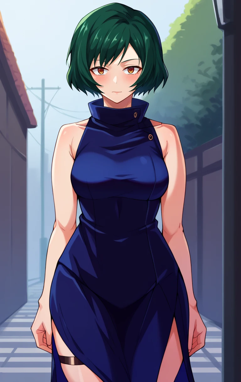 MaiZeninSDXL,1girl,solo,short hair,green hair,brown eyes,black hair,dress,thighs strap,bare shoulders,sleeveless,high collar,sleeveless dress