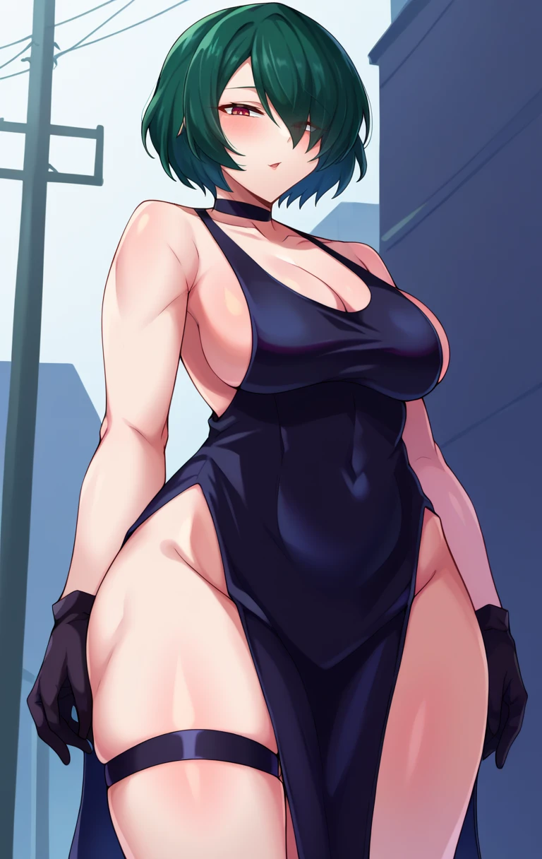 MaiZeninSDXL,MaiZeninSDXL,1girl,solo,short hair,green hair,brown eyes,black gloves,black dress,cleavage,bare shoulders,parted lips,choker,hair over one eye,sideboob,skindentation,thigh strap,backless outfit,backless dress