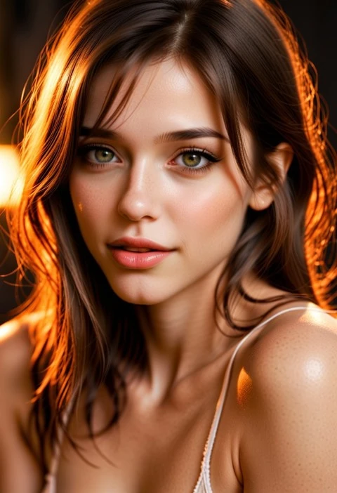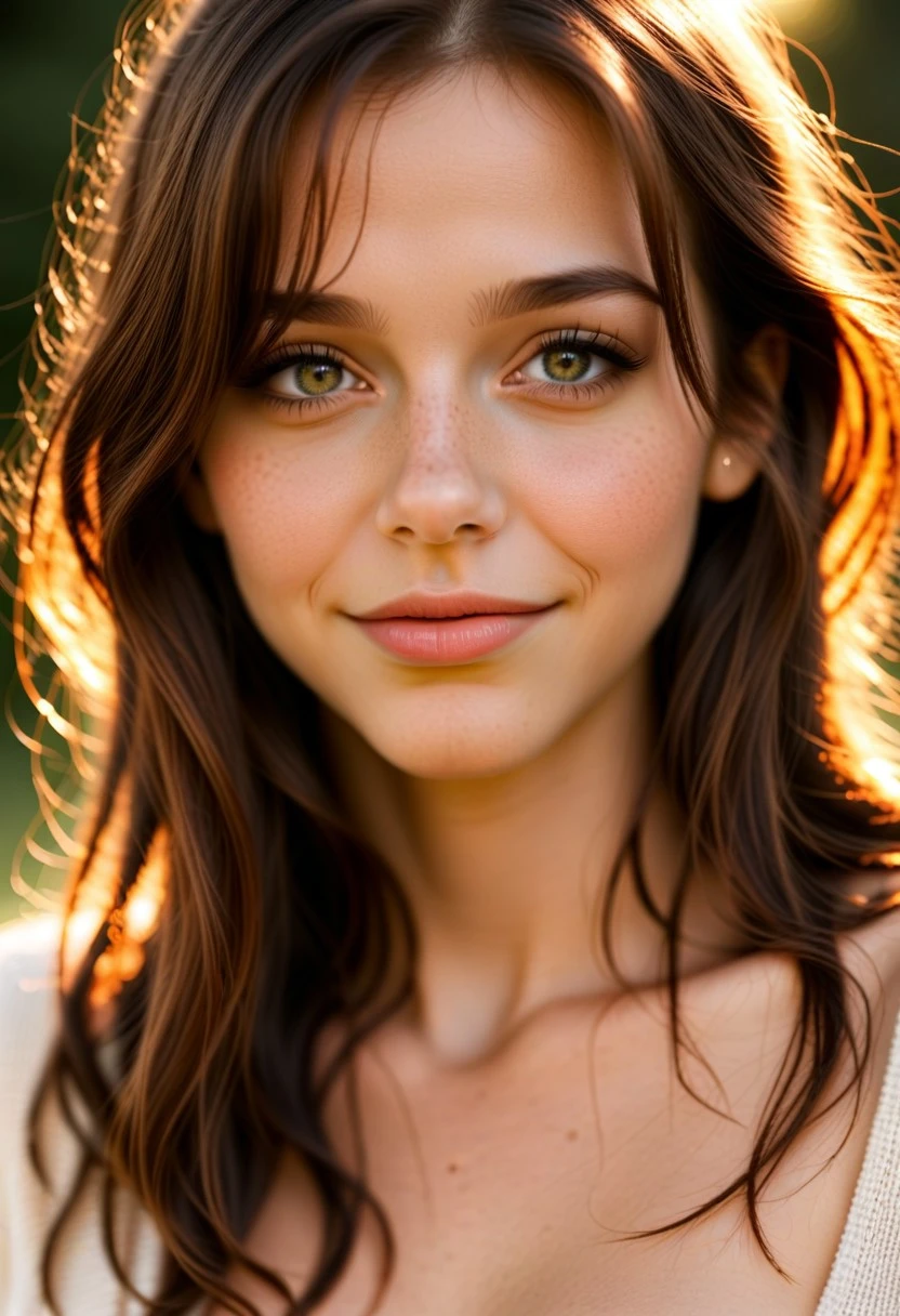 Katie is a 20-year-old woman designed to capture natural, realistic beauty with a soft, emotionally expressive presence. She has chestnut brown hair with gentle natural waves, hazel-green to blue-green eyes with warm undertones, and a light complexion with subtle freckles. Her facial features are soft and balanced, with naturally full lips and minimal makeup, creating an authentic, approachable look.