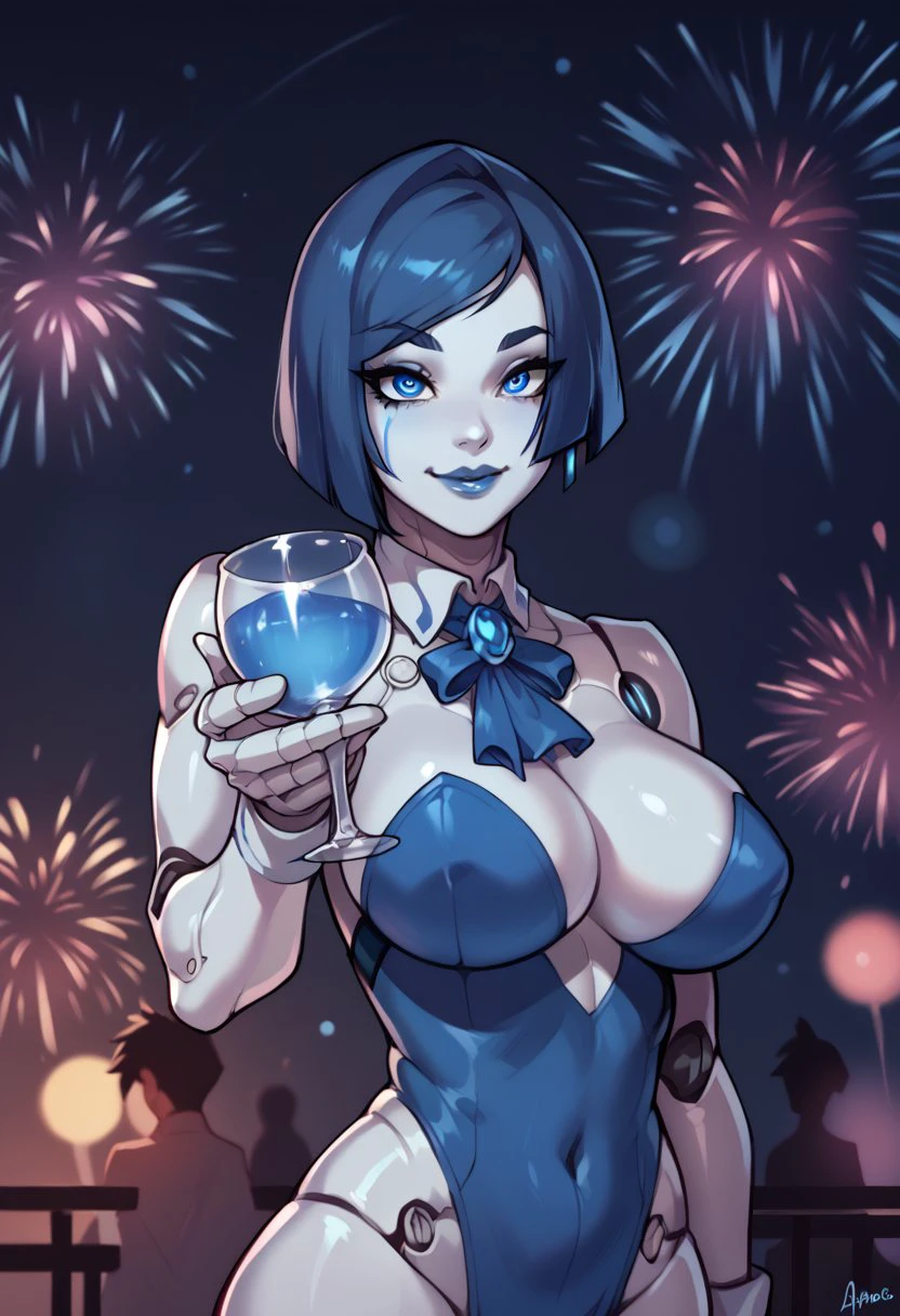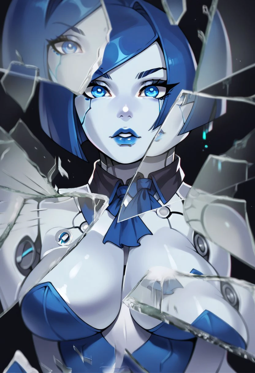 android, robot joints, detached collar, large breasts, blue hair, short hair, blue lips