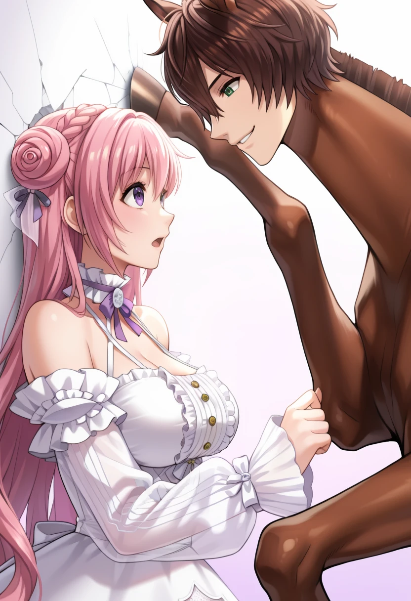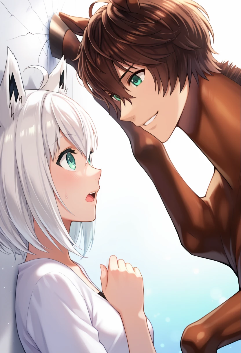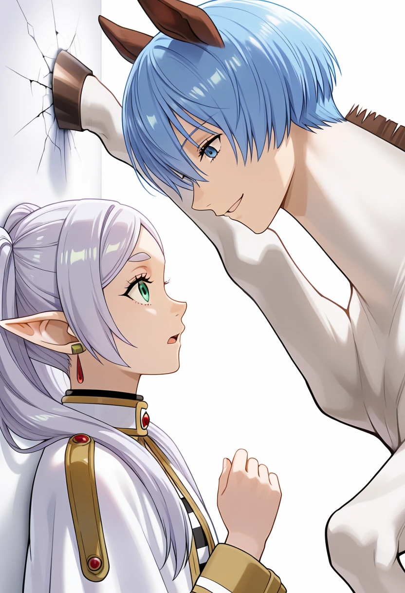 Trigger word: kabedon, looking at another, against wall, cracked wall