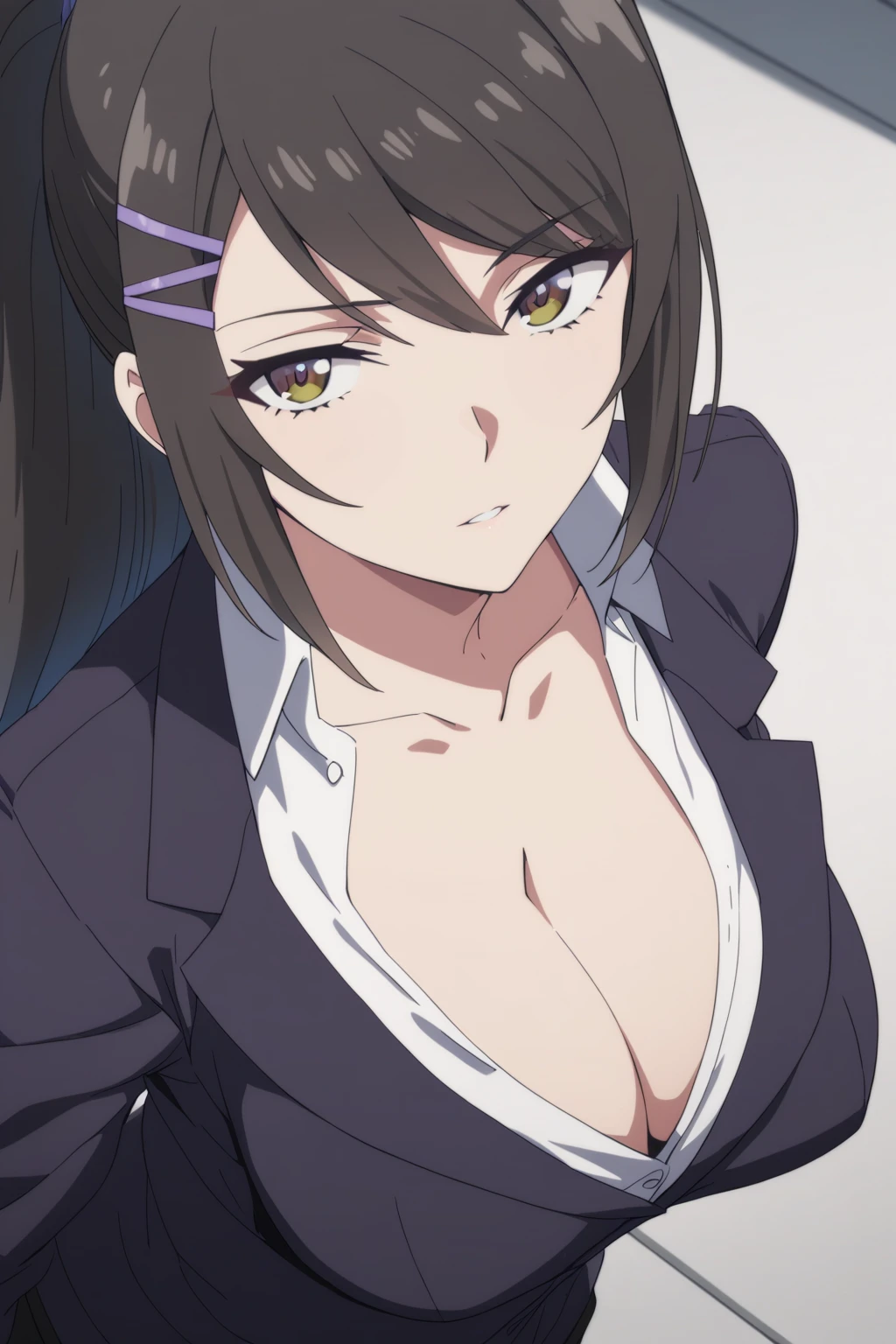 Base Prompt: chabashira, 1girl, ponytail, black hair, hairclip, cleavage, breasts,