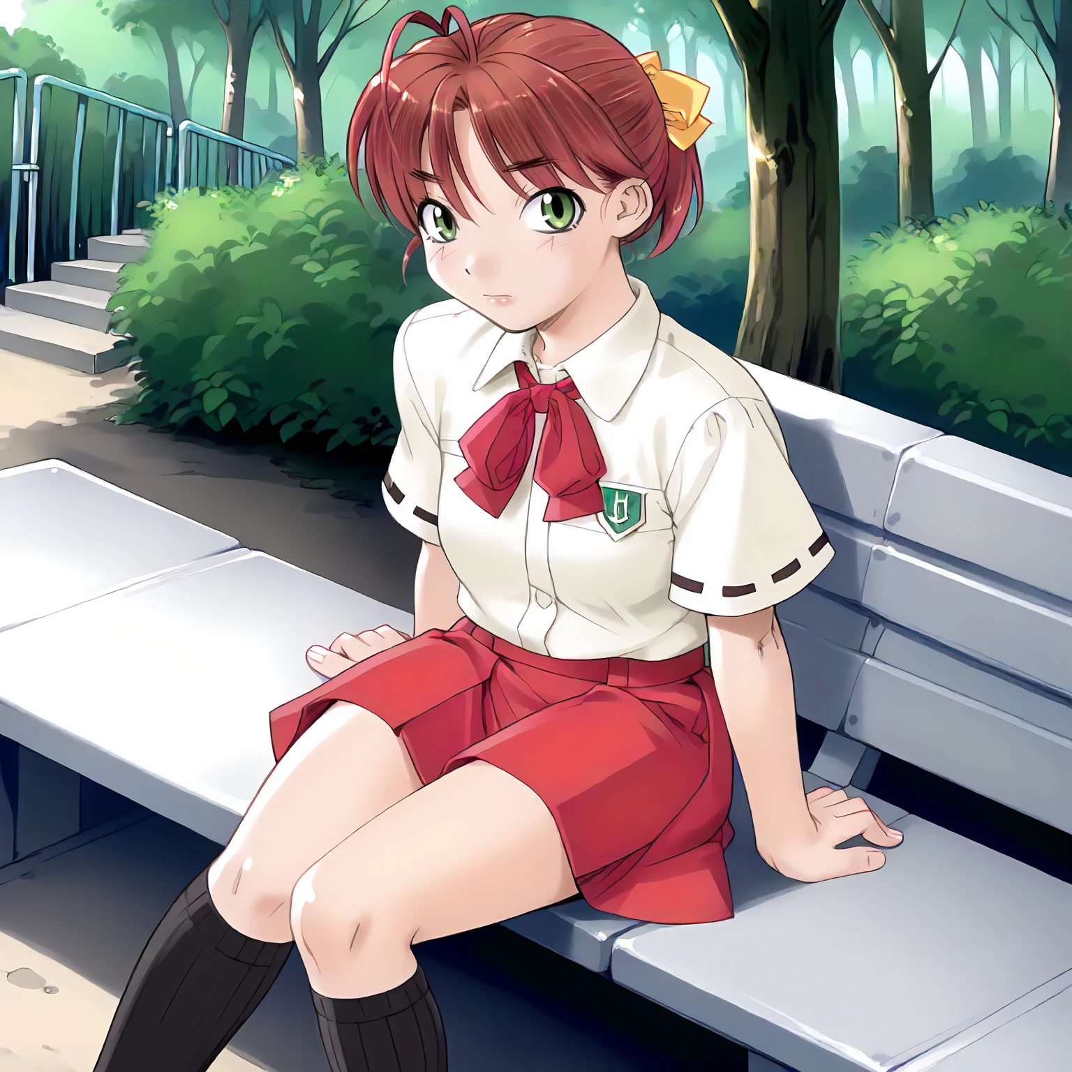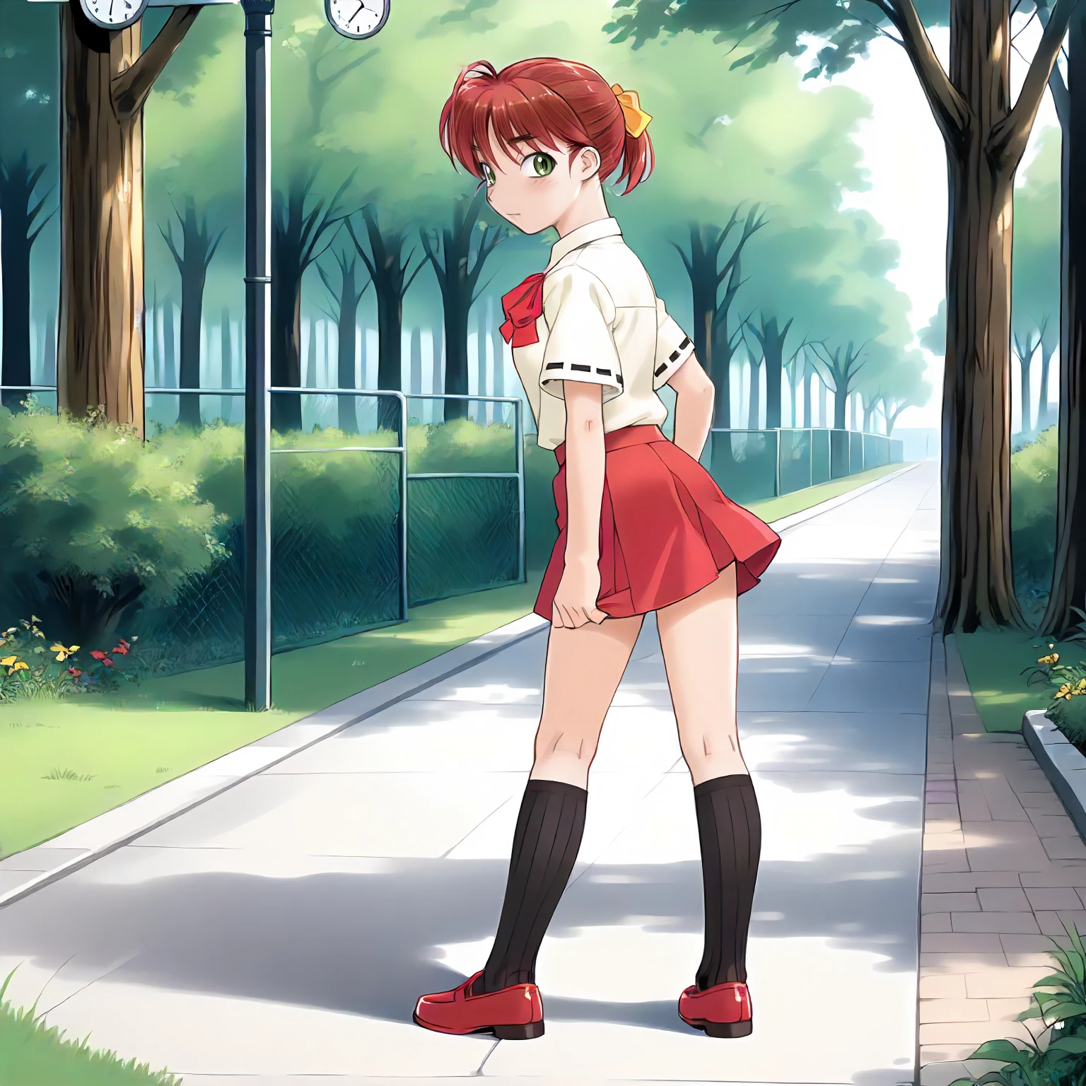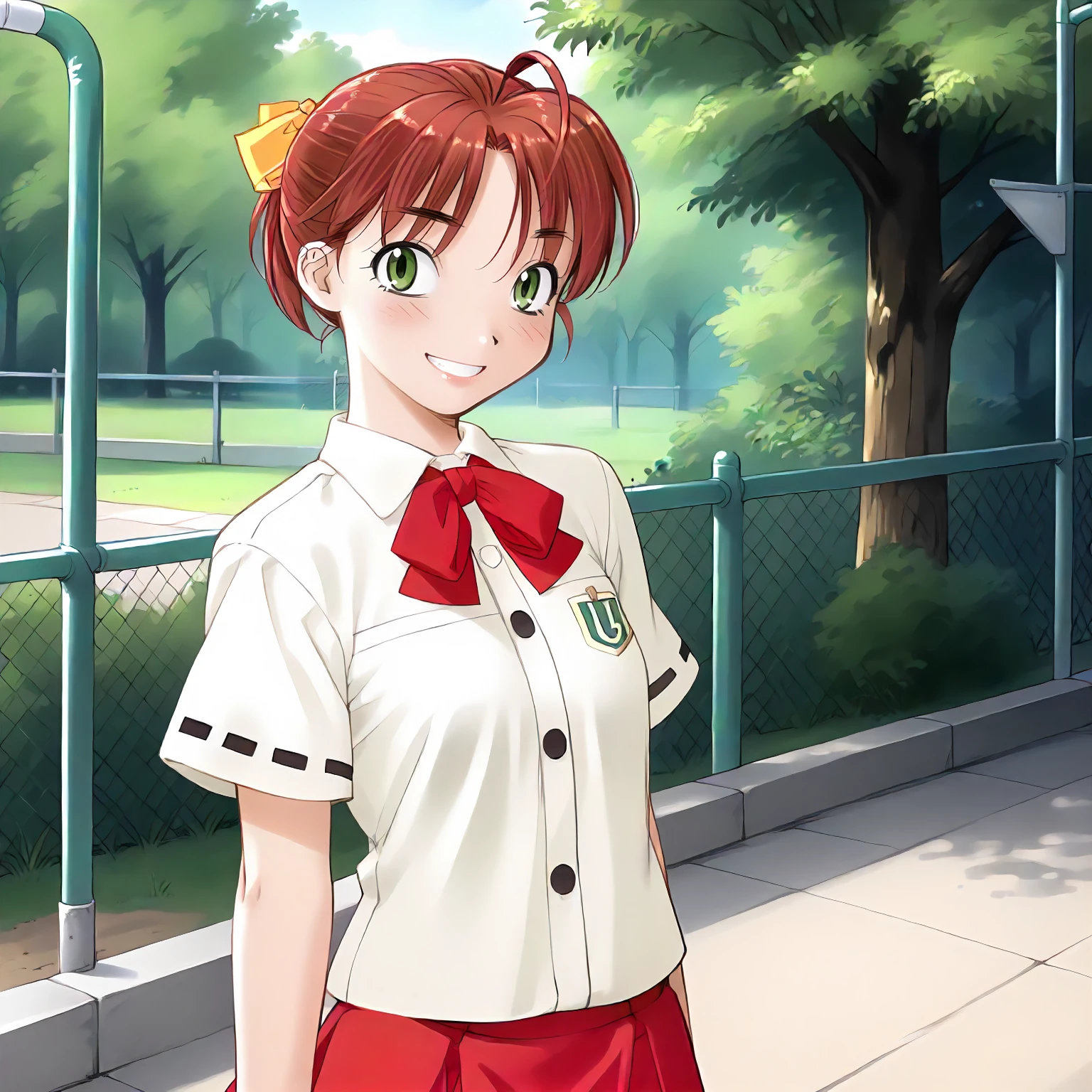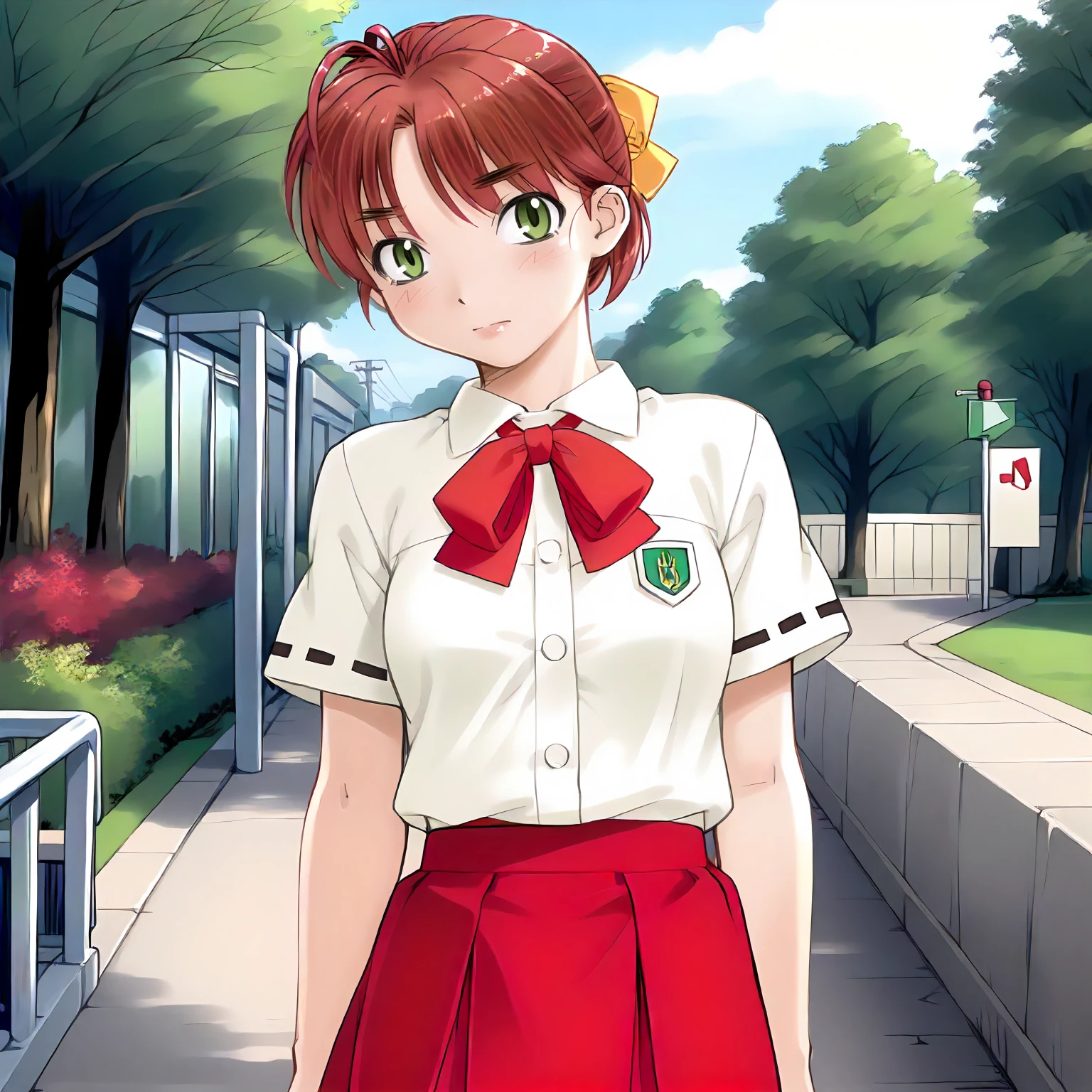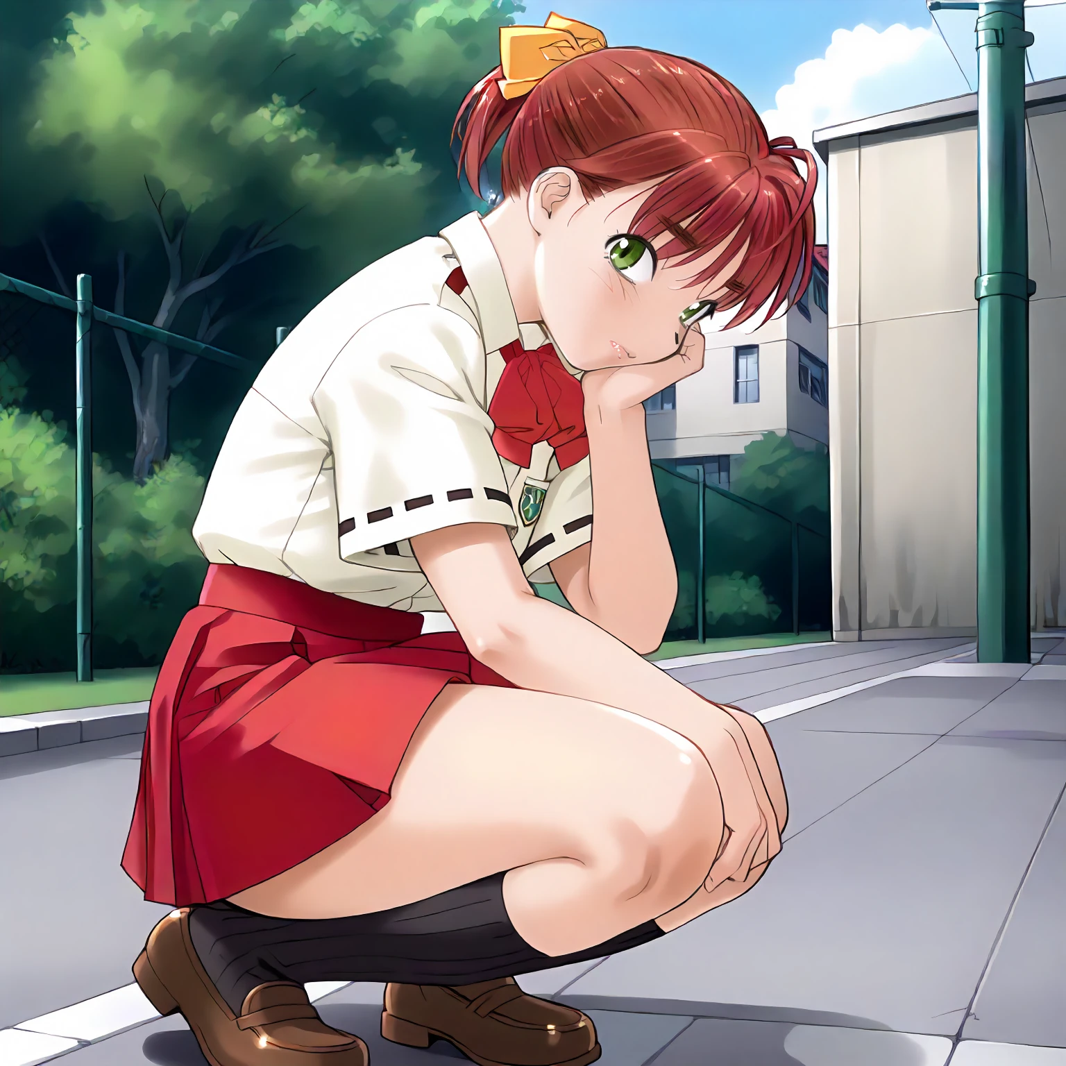 MinaHayase,1girl,red hair,short ponytail,hair ribbon,green eyes,