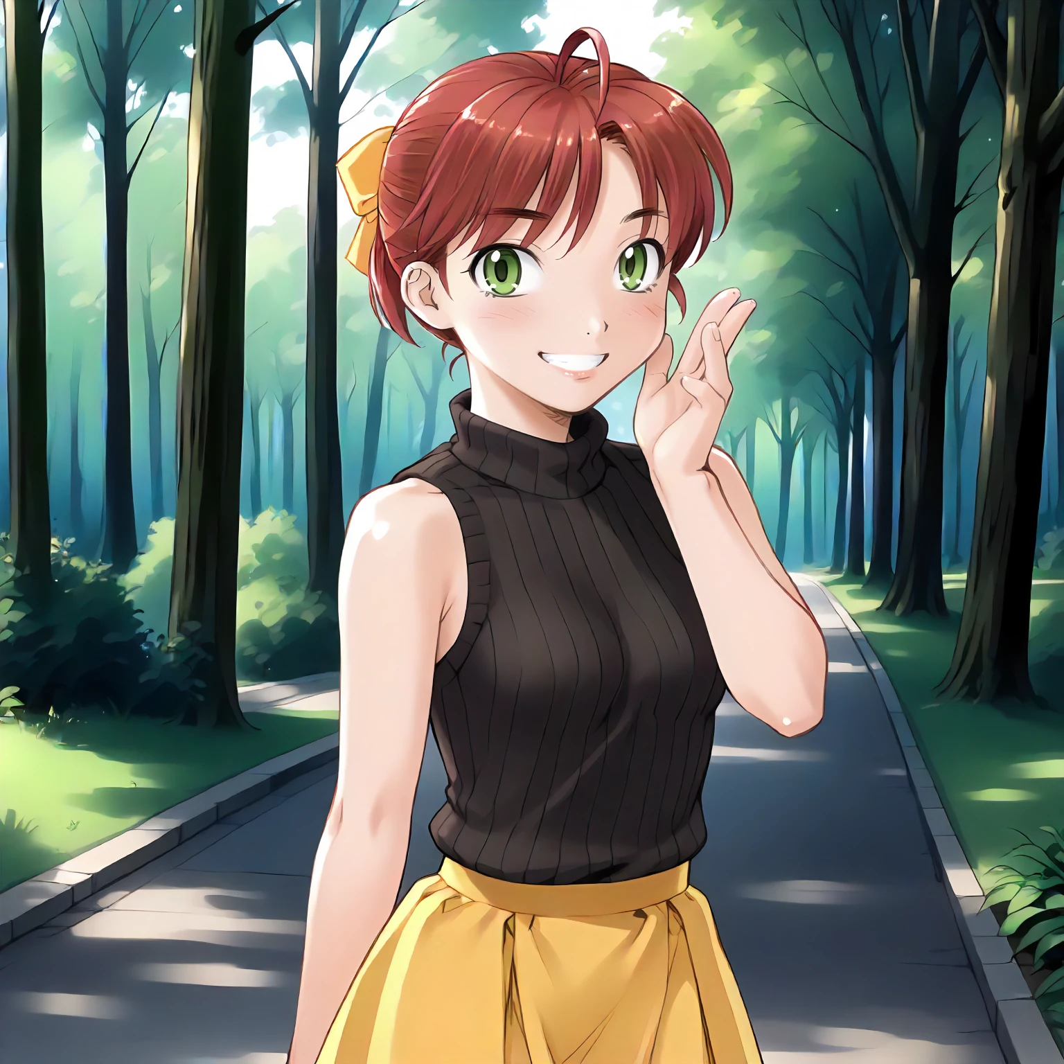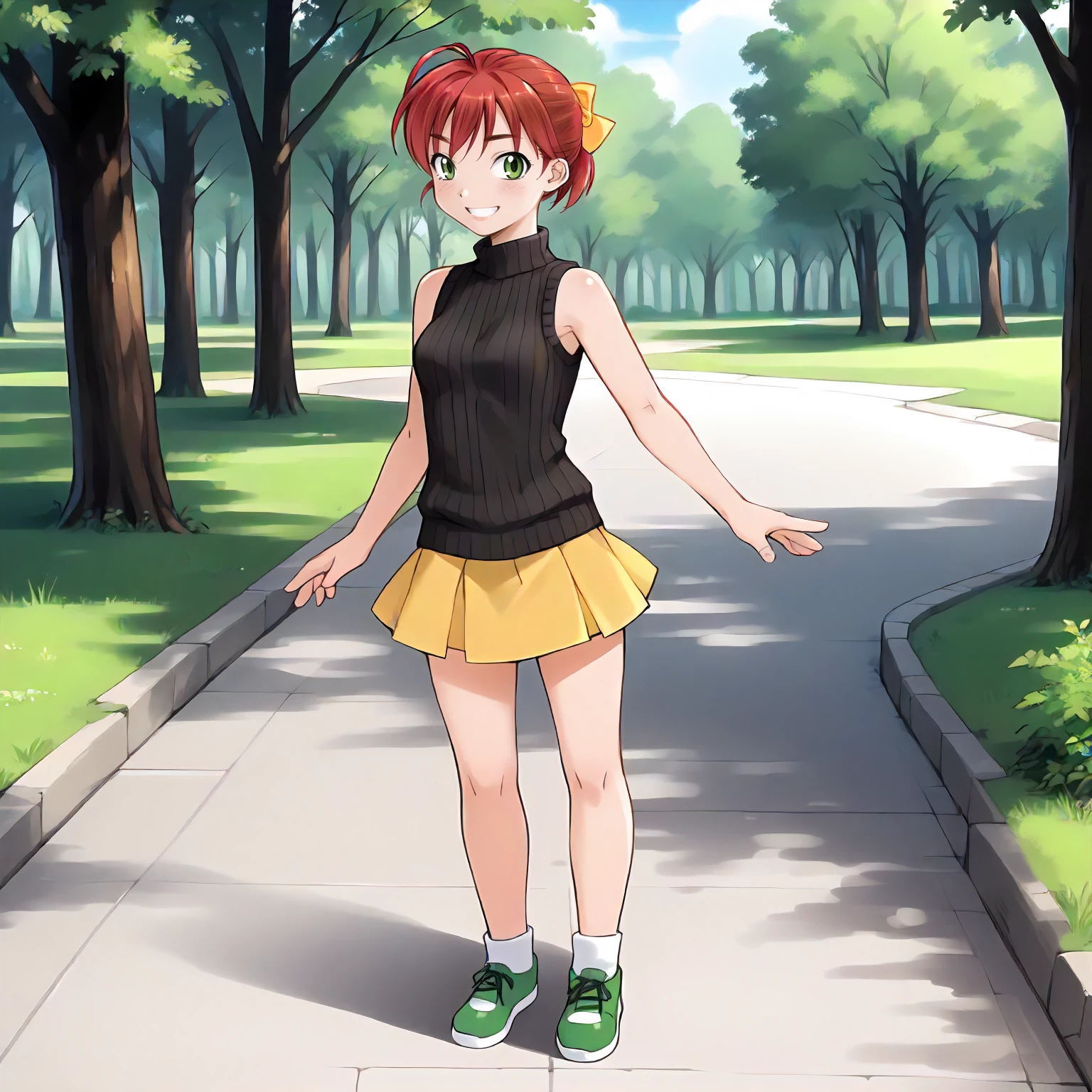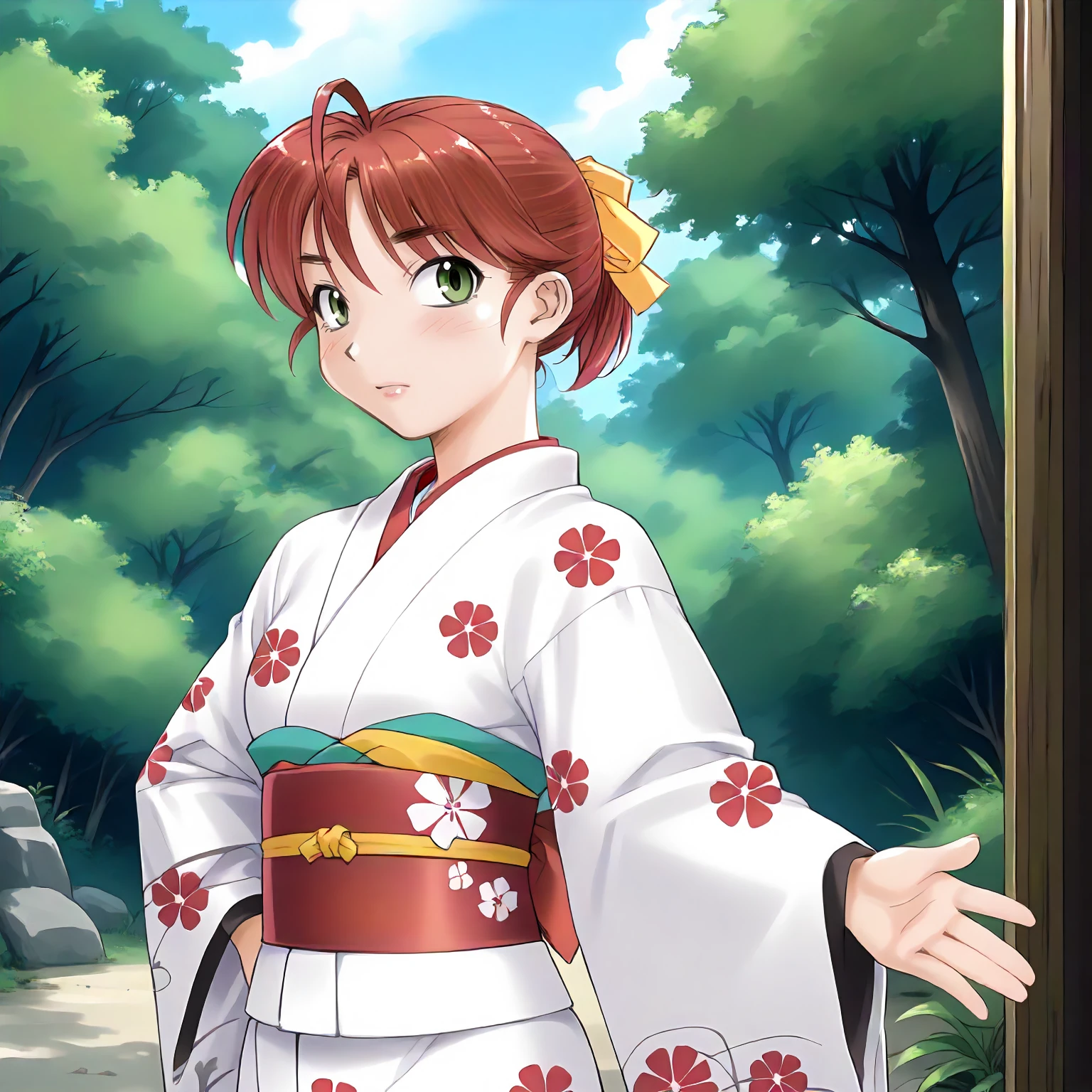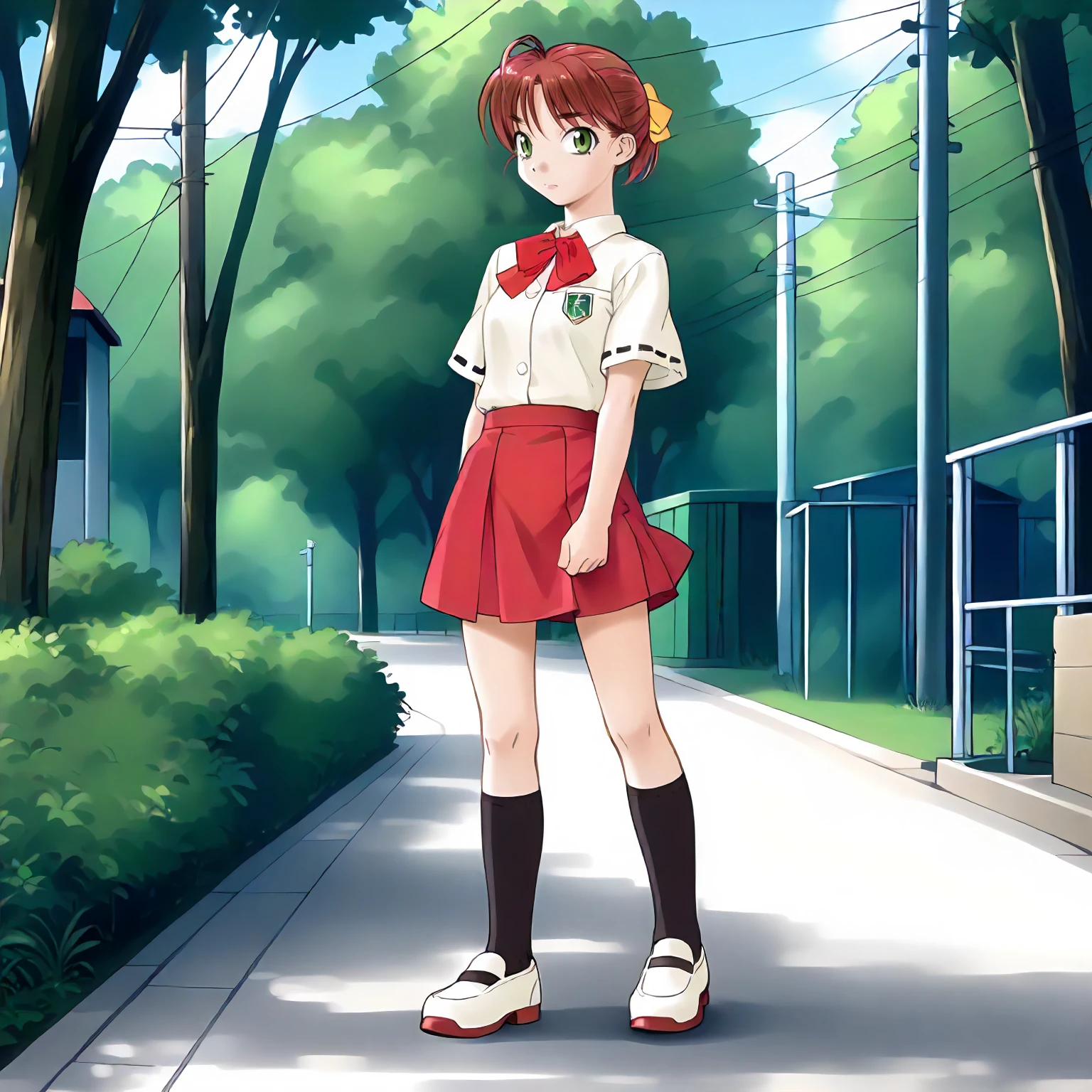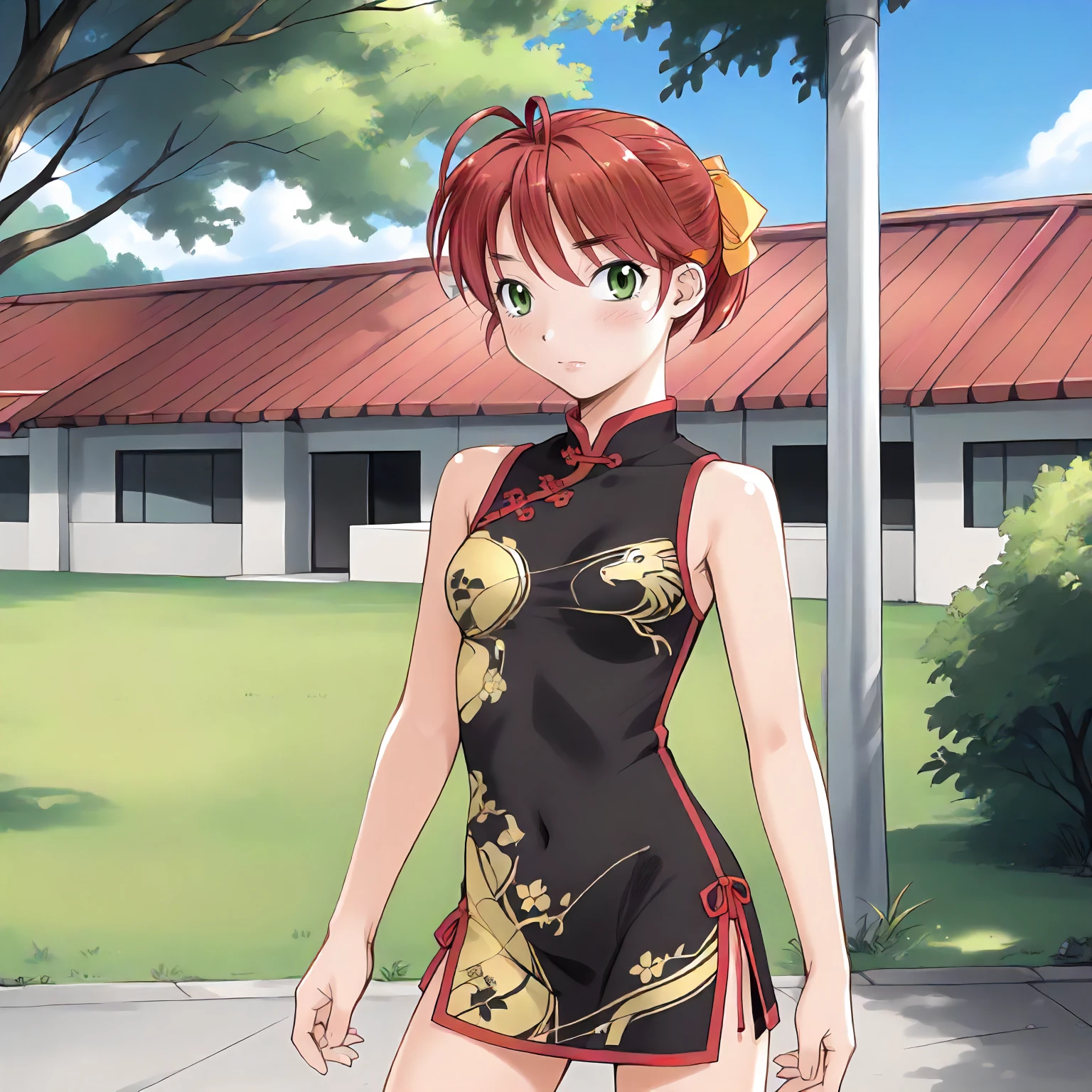 MinaHayase,1girl,red hair,short ponytail,hair ribbon,green eyes,