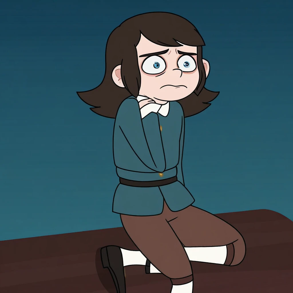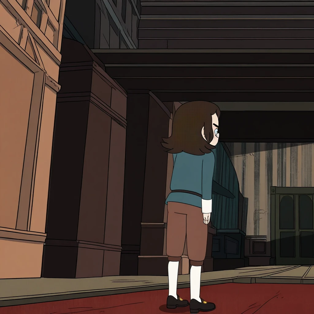 AbaddonCharacter, 1boy, solo, male child, Abaddon hair style, dark brown hair, fair skin, blue eyes, droopy eyelids, thin and short body, dark teal long-sleeve shirt, black belt, brown knee-length pants, white stockings, black shoes with gold buckles,