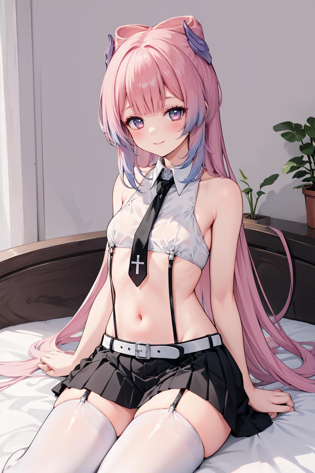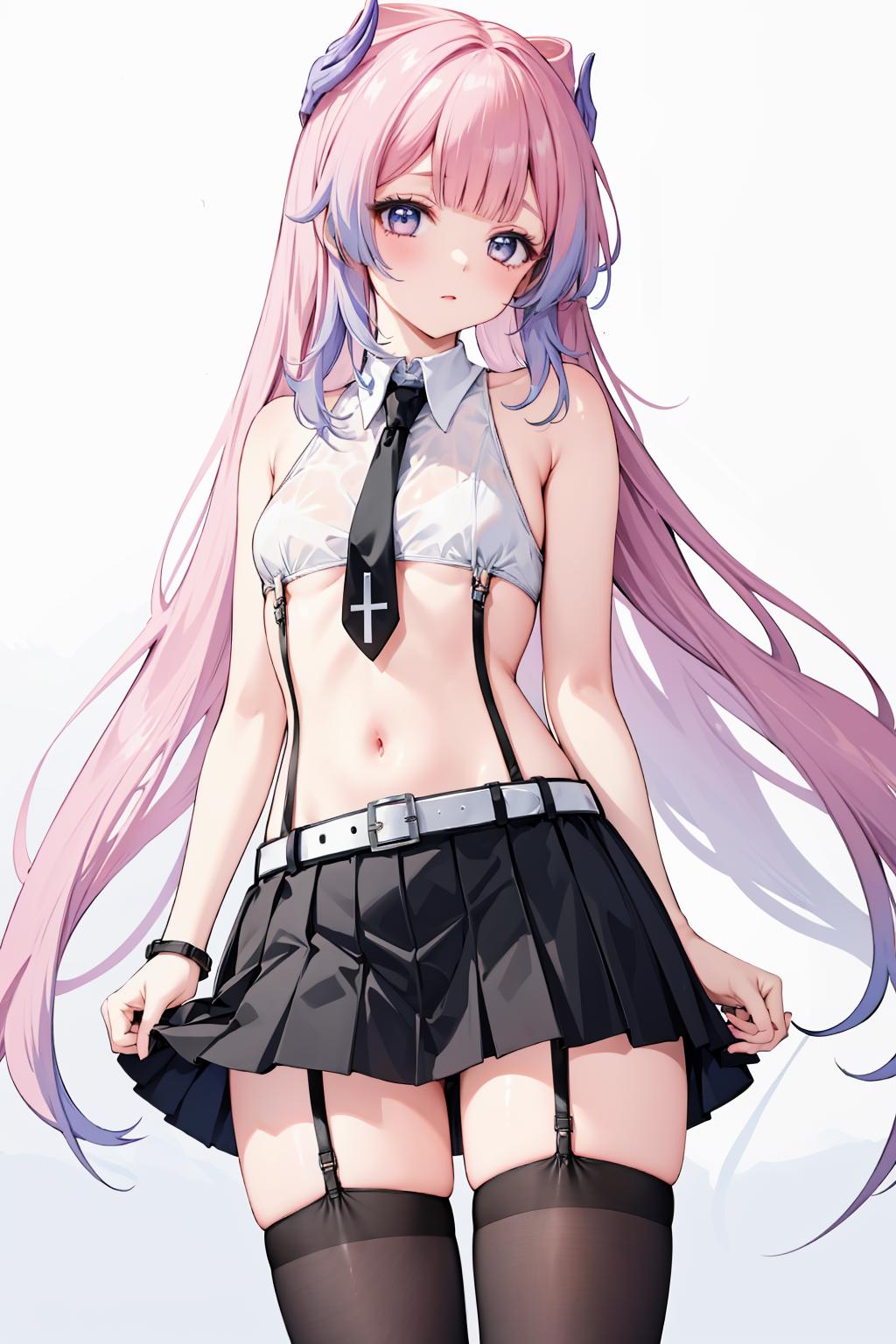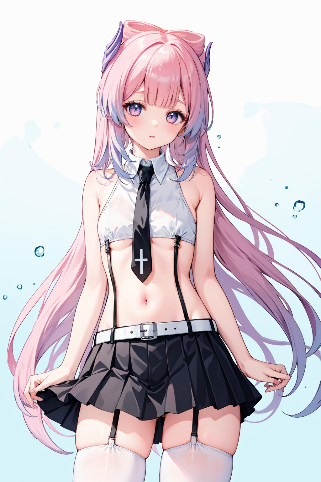 Prompts: suspender skirt, sleeveless shirt, garter straps, thighhighs, black necktie, belt, navel/crop top
