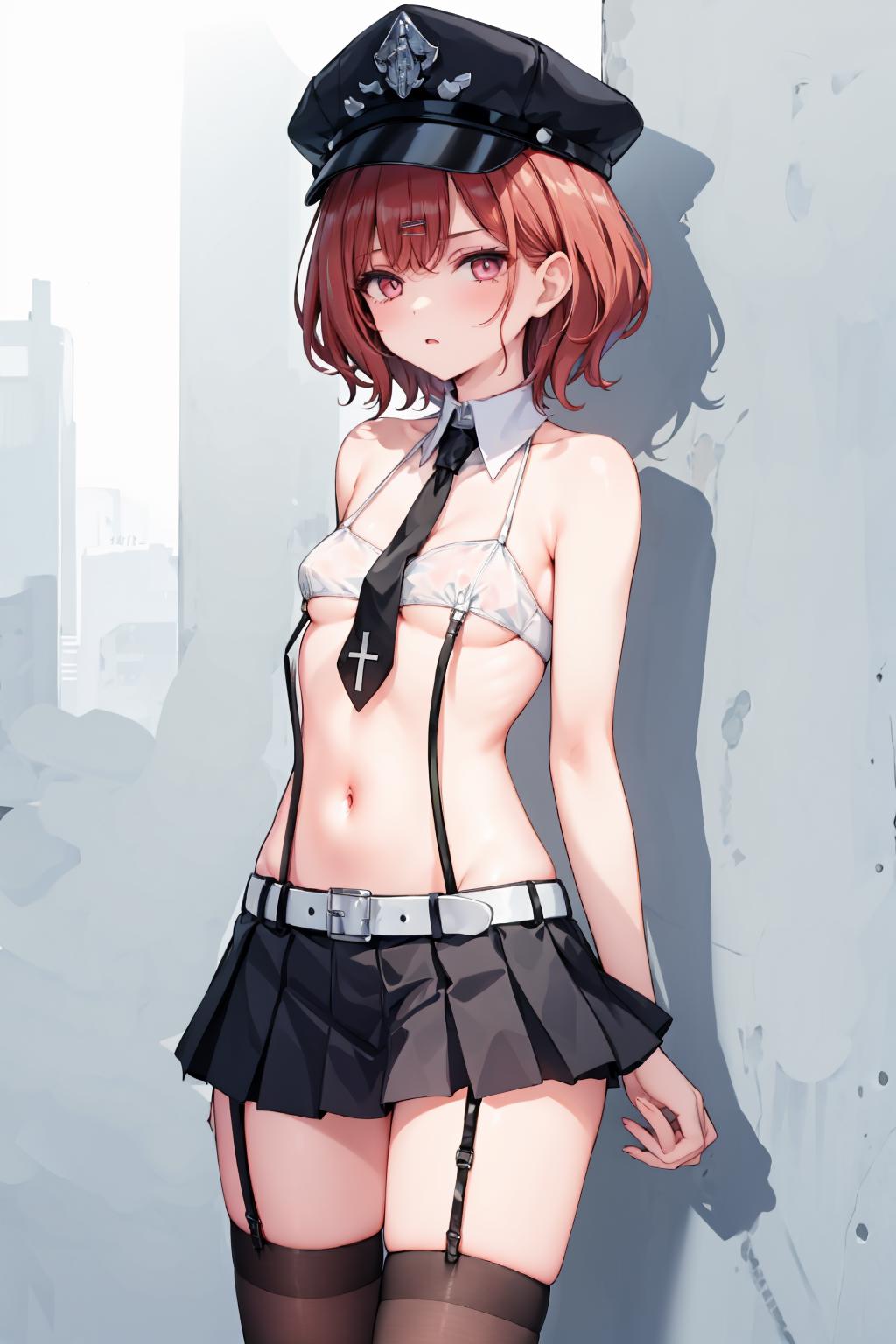 提示词:suspender skirt, sleeveless shirt, garter straps, thighhighs, black necktie, belt, navel/crop top