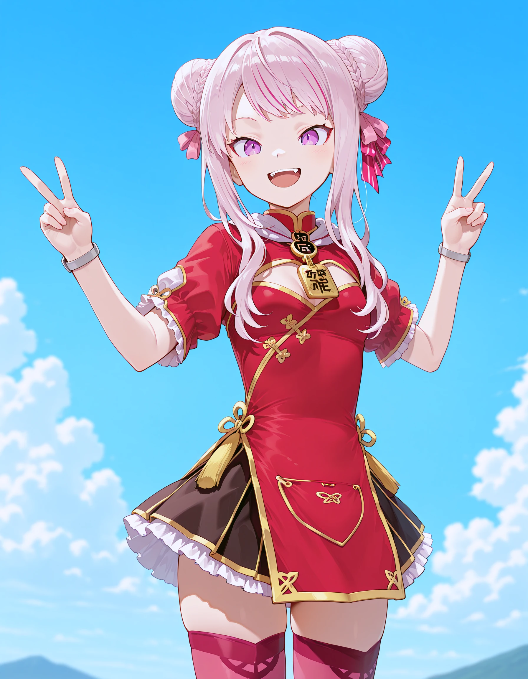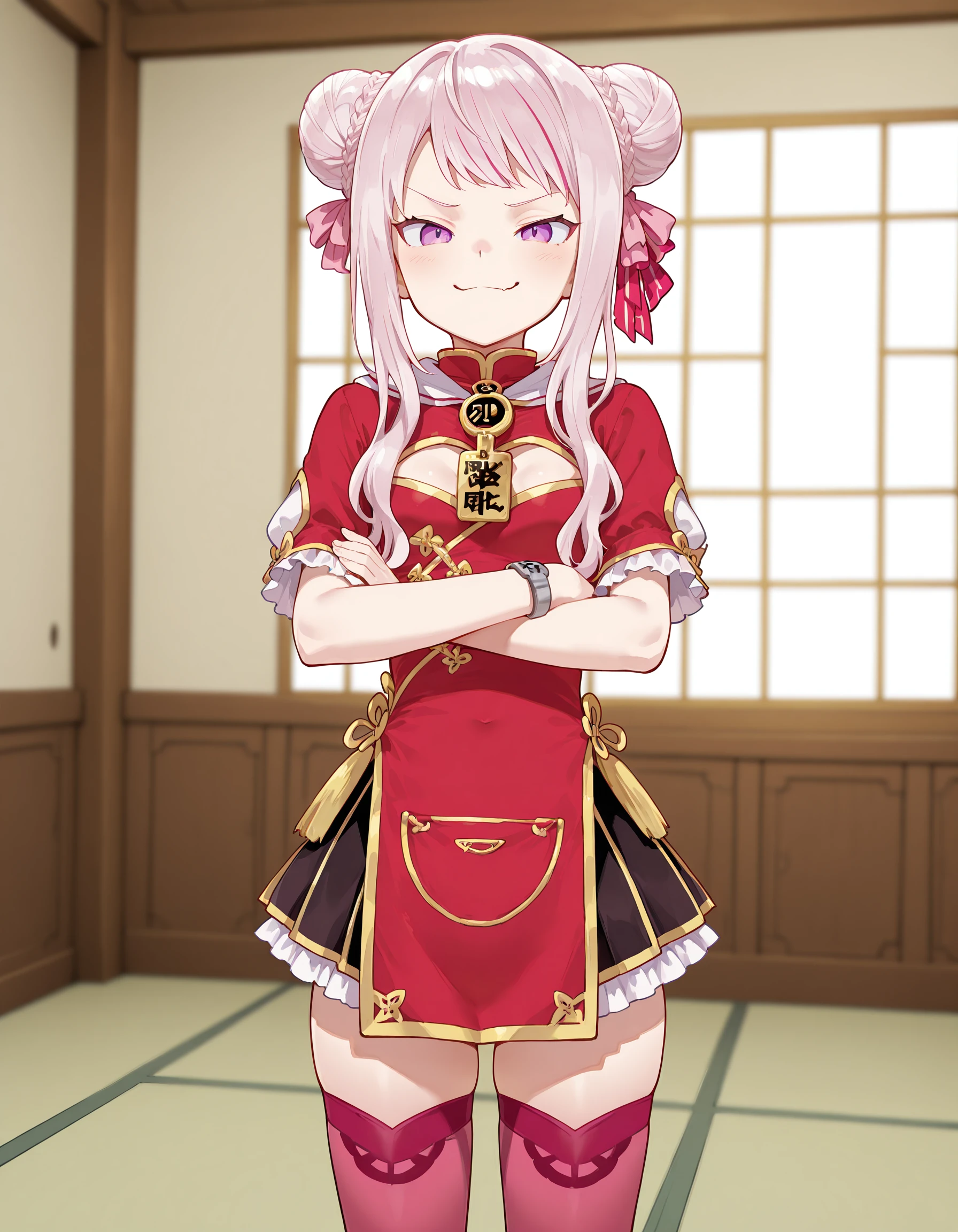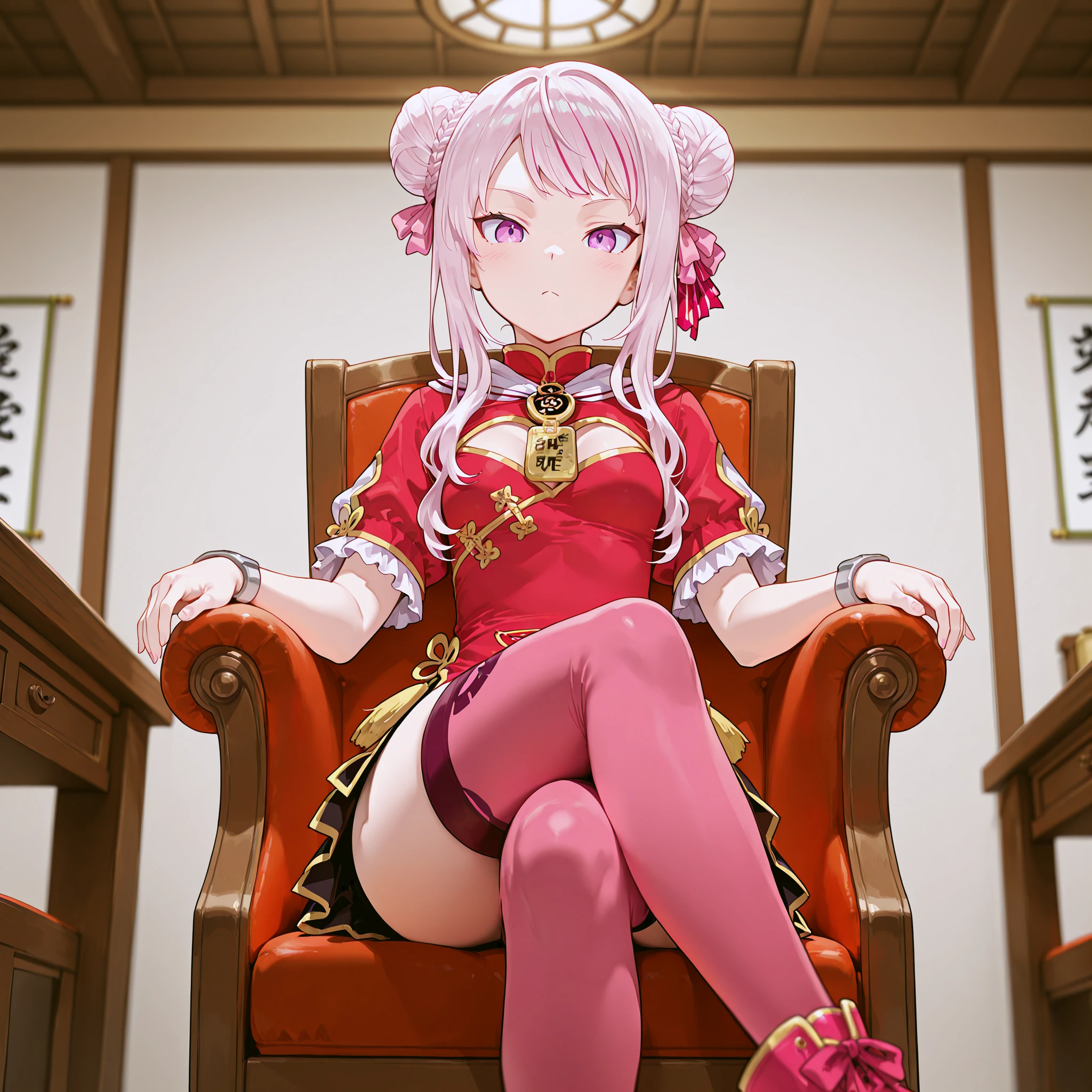 tanaka hime, pink hair, sidelocks, streaked hair, purple eyes, skinny, small breasts, double bun, hair ribbon, chinese clothes, gold medallion, gold dogtag, frills, pink thighhighs, red dress, black skirt, short skirt, cleavage cutout, bootsDescription