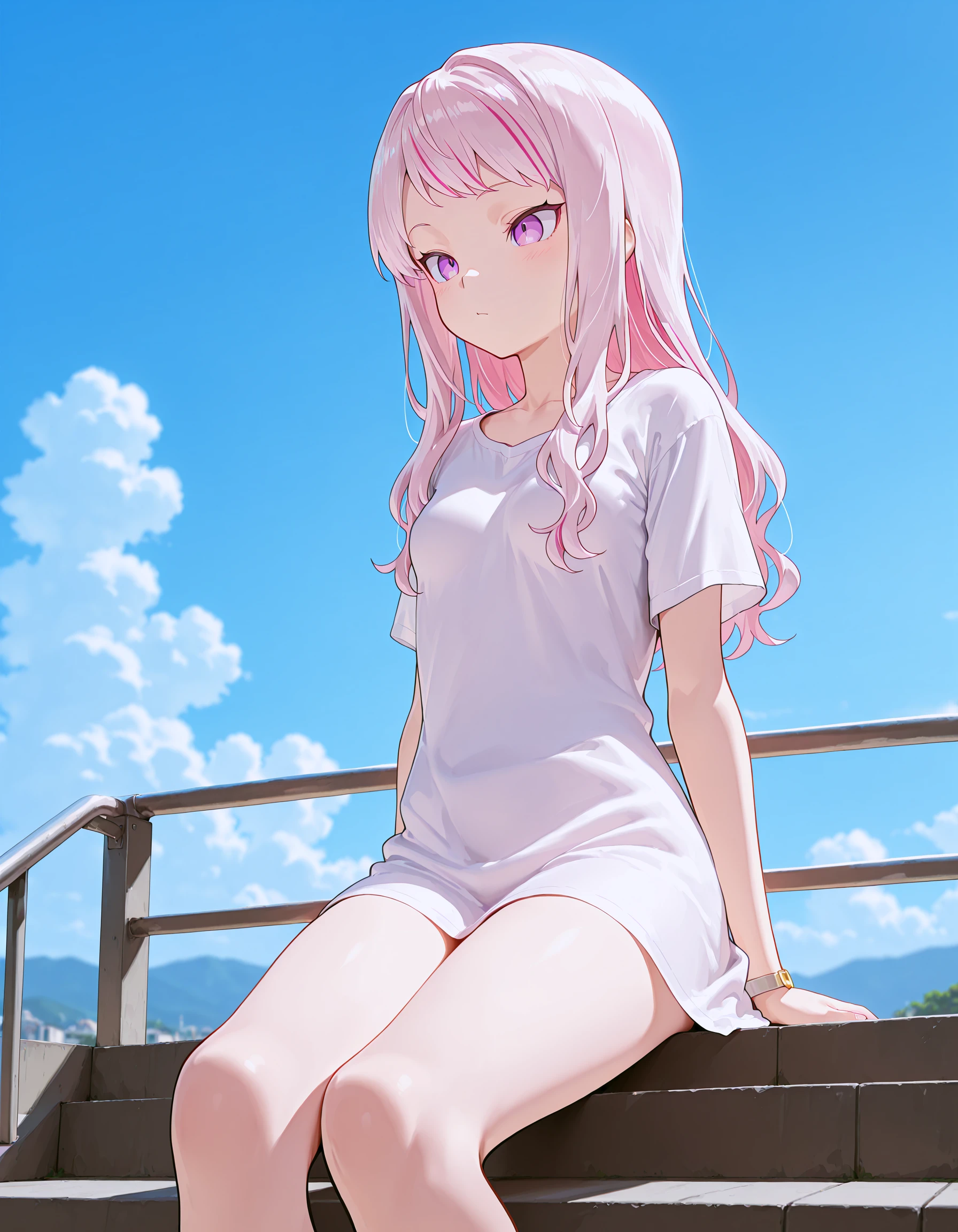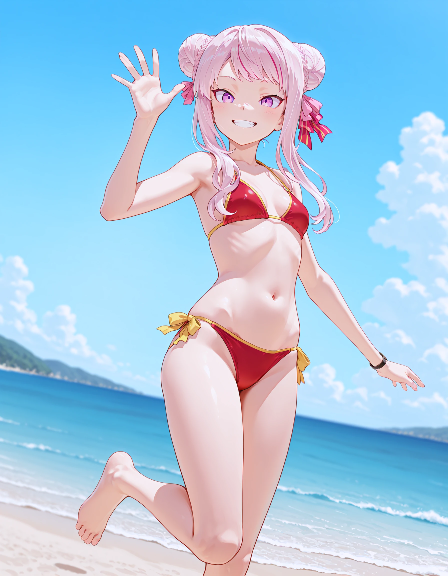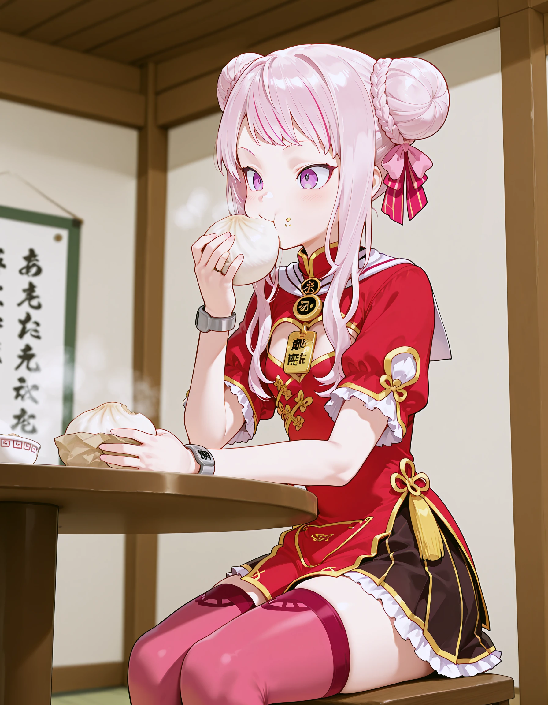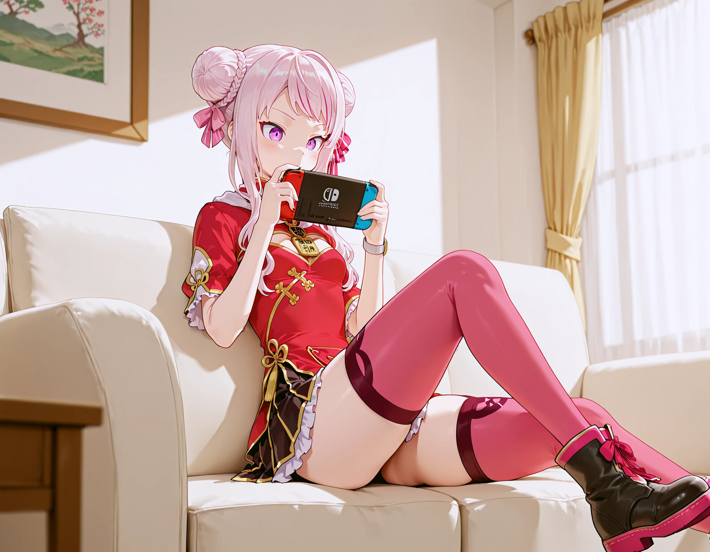 tanaka hime, pink hair, sidelocks, streaked hair, purple eyes, skinny, small breasts, double bun, hair ribbon, chinese clothes, gold medallion, gold dogtag, frills, pink thighhighs, red dress, black skirt, short skirt, cleavage cutout, bootsDescription