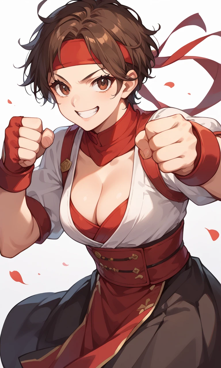 "SAKURASF,brown hair, brown eyes, black dress, pink tie, red headband, framed breasts, white collared shirt, mma gloves" for her new SFV outfit.