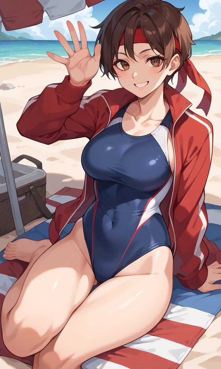 "SAKURASUM, brown hair, brown eyes, blue one-piece swimsuit, jacket over swimsuit, red track jacket" for her swimsuit.