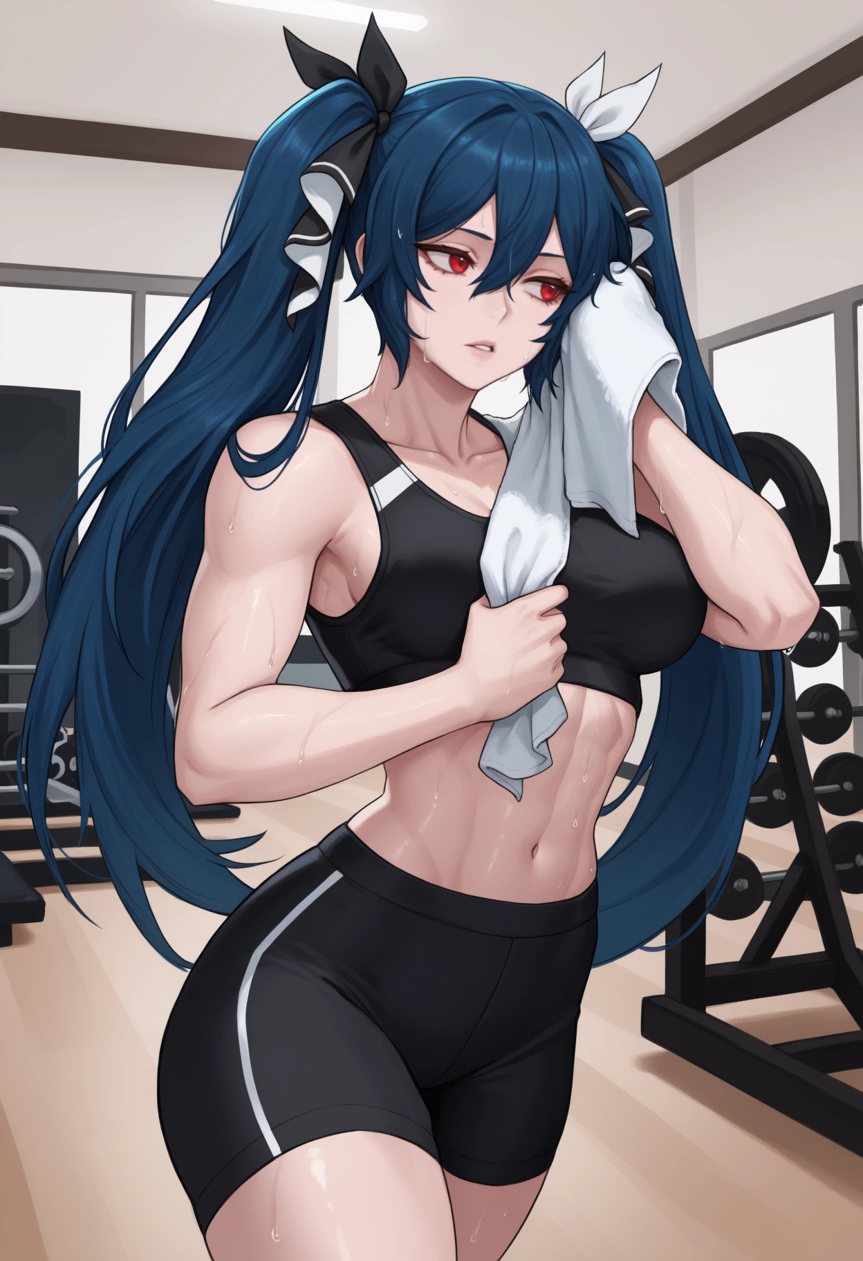 d4rkm1ku, long hair, blue hair, hair between eyes, uneven twintails, hair ribbon, two-tone ribbon, black ribbon, white ribbon, red eyes
