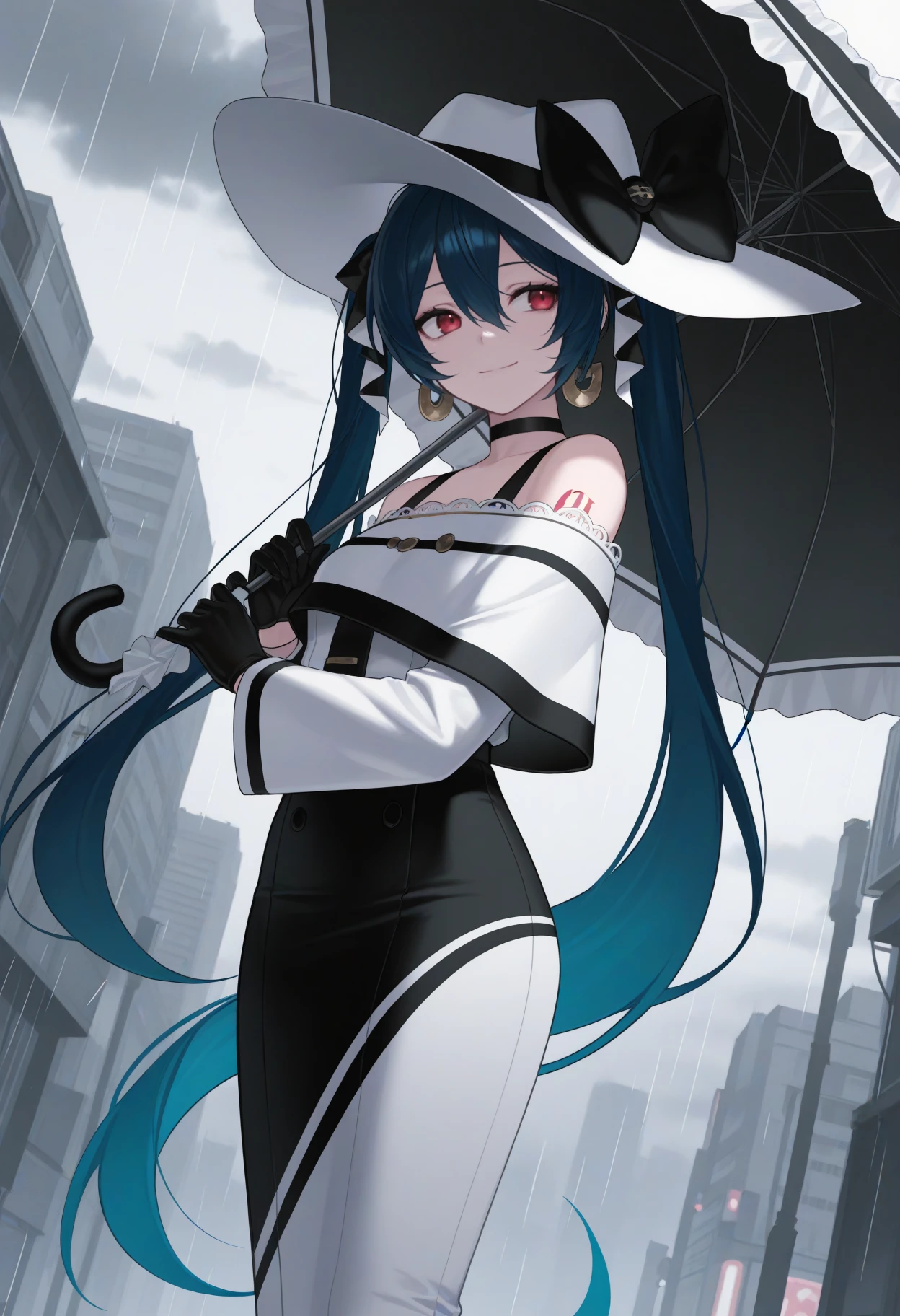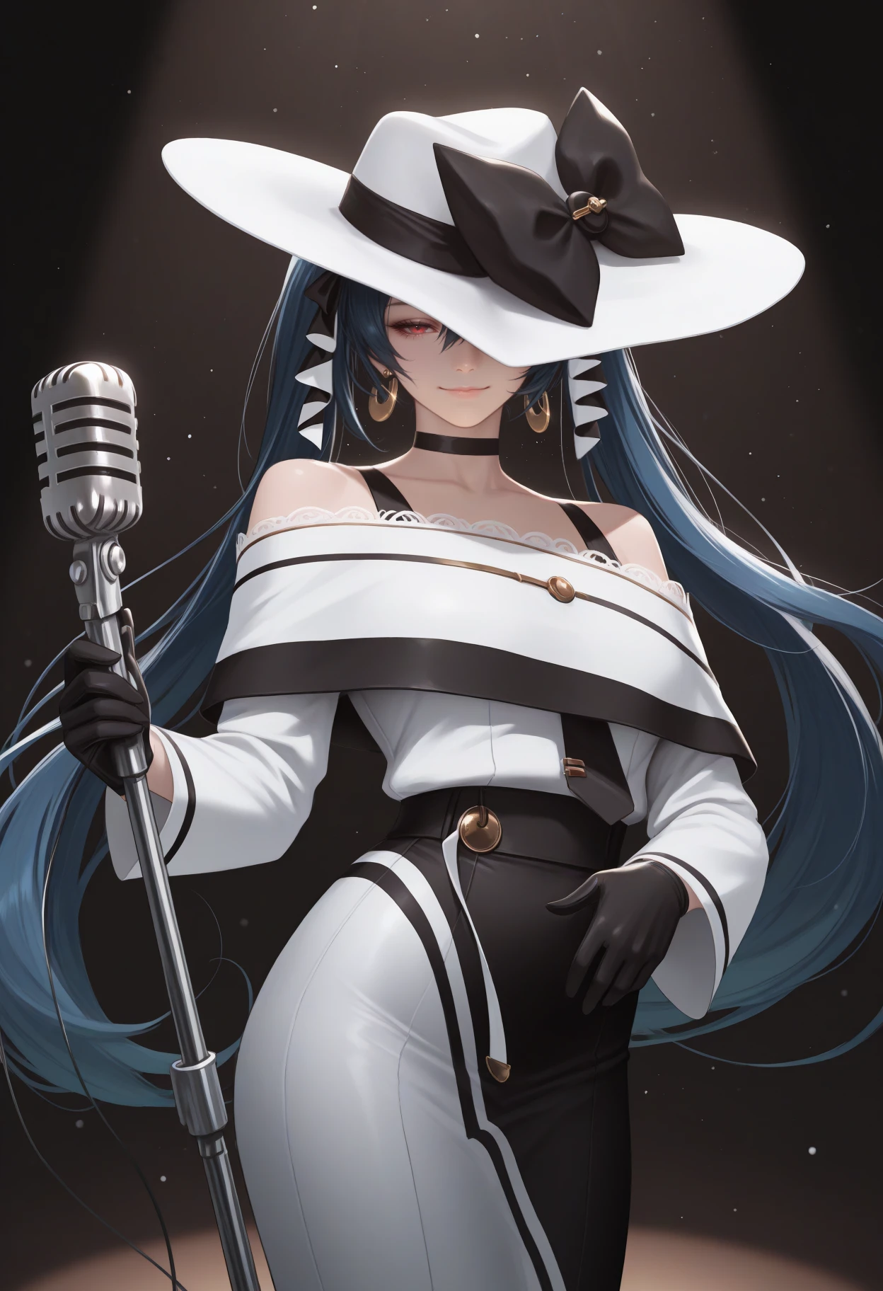 Default Outfit: white headwear, hat bow, black bow, long dress, two-tone dress, white dress, black ??????????-shoulder dress, long sleeves, black gloves, earrings, black choker, bare shoulders