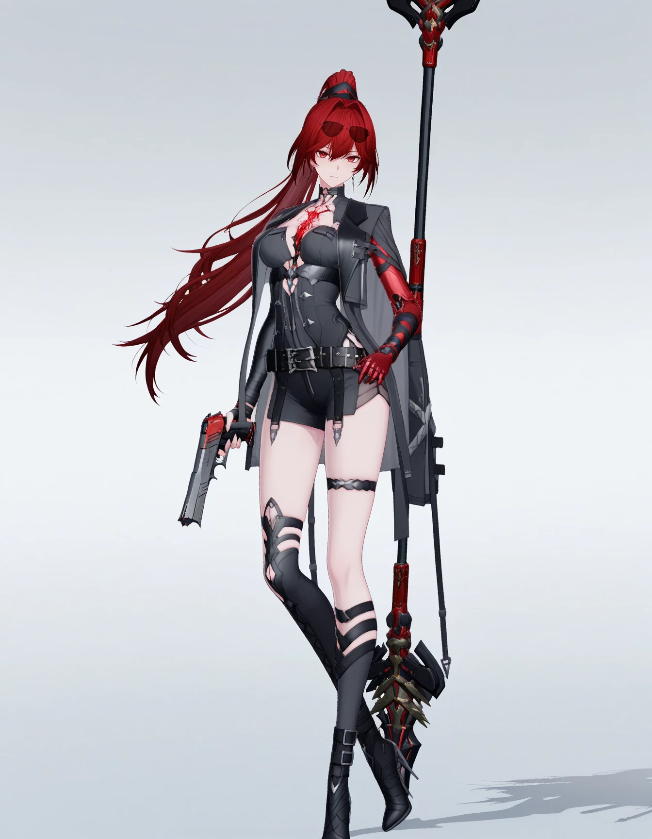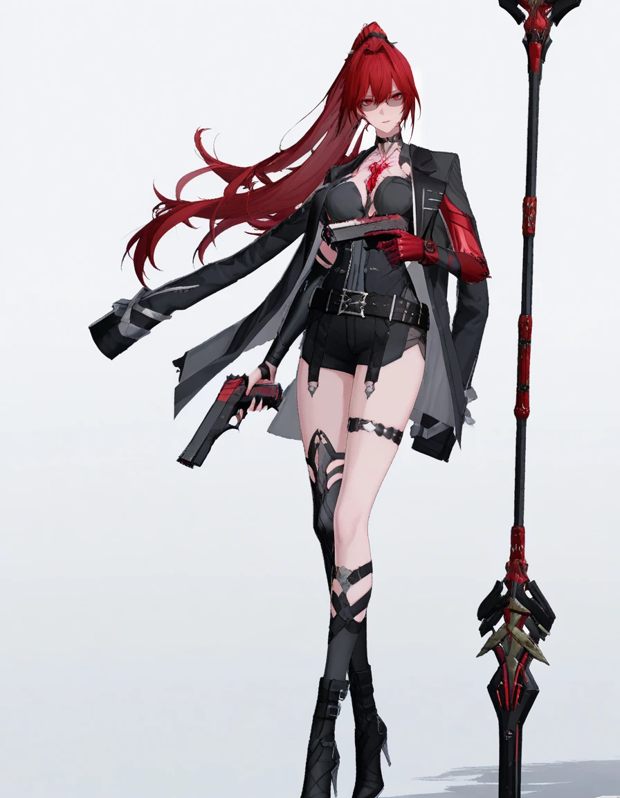 mai_pgr_vzw_yxcj,long_hair,ponytail,red_hair,red_eyes,mature_female,(aged_up:1.5),glasses,earrings,chest_jewel,black_jacket,mechanical_arms,red_gloves,belt,black_shorts,asymmetrical_legwear,mismatched_legwear,uneven_legwear,single_sock,single_kneehigh,holding_polearm,holding_gunRecommend preferred Strength: 0.8~1.