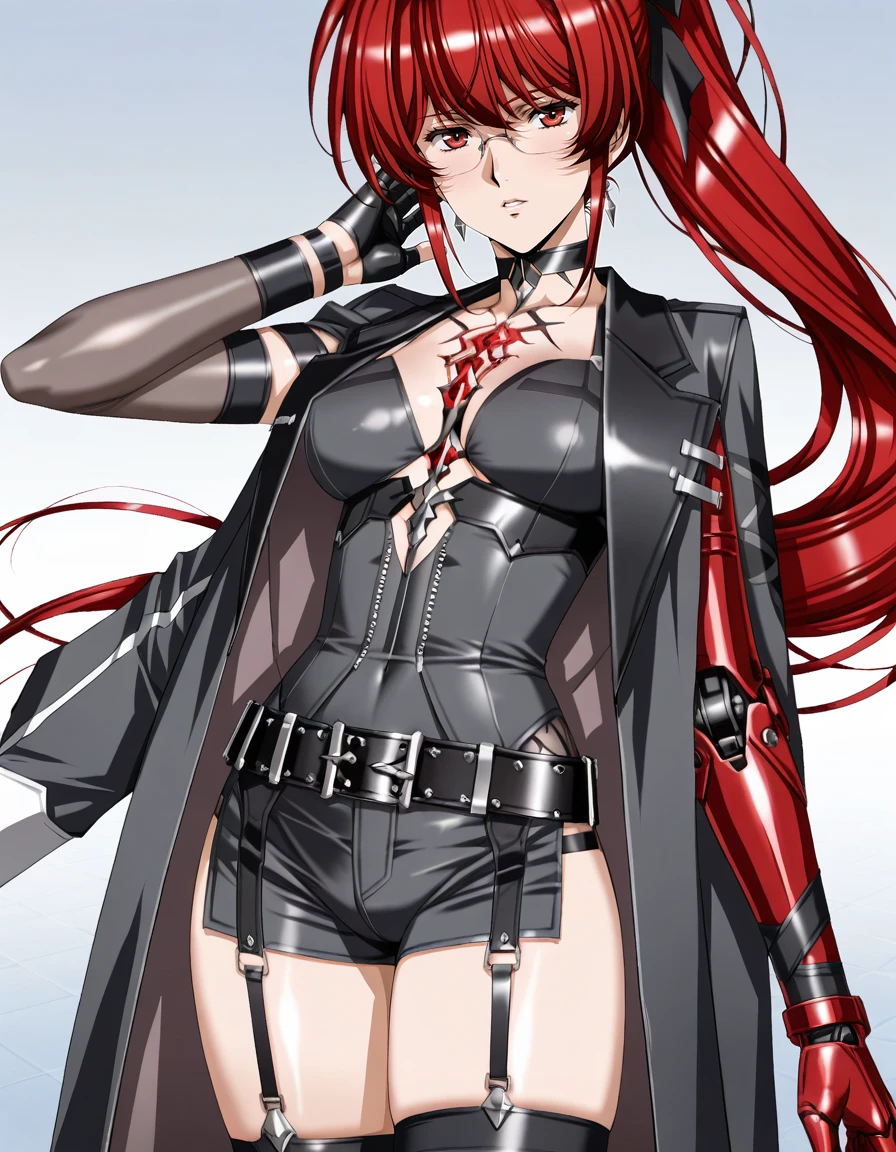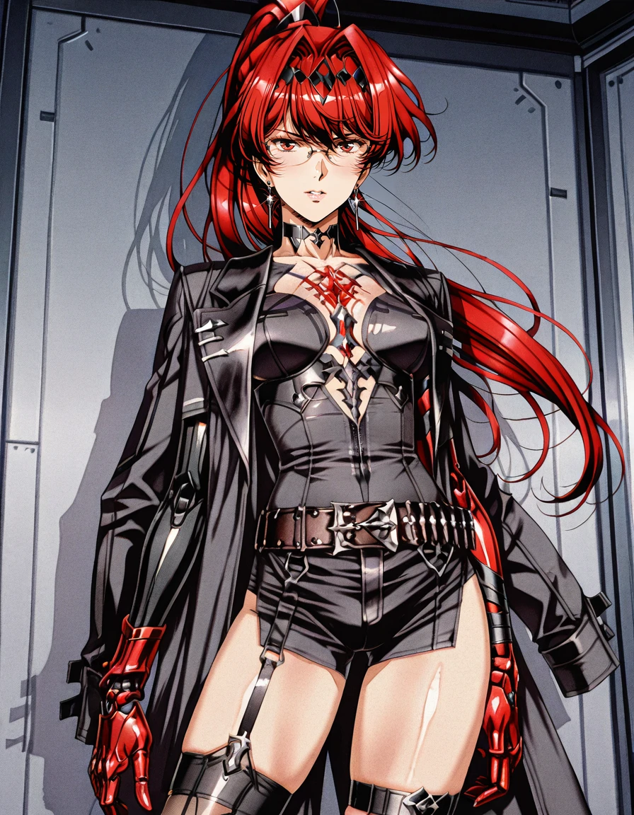 mai_pgr_vzw_yxcj,long_hair,ponytail,red_hair,red_eyes,mature_female,(aged_up:1.5),glasses,earrings,chest_jewel,black_jacket,mechanical_arms,red_gloves,belt,black_shorts,asymmetrical_legwear,mismatched_legwear,uneven_legwear,single_sock,single_kneehigh