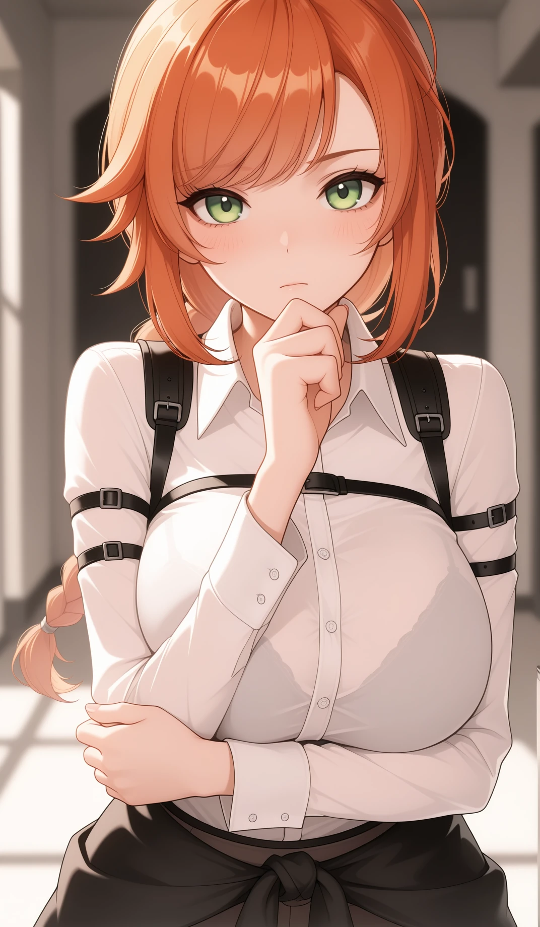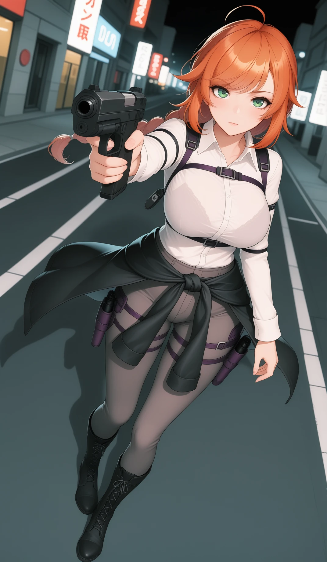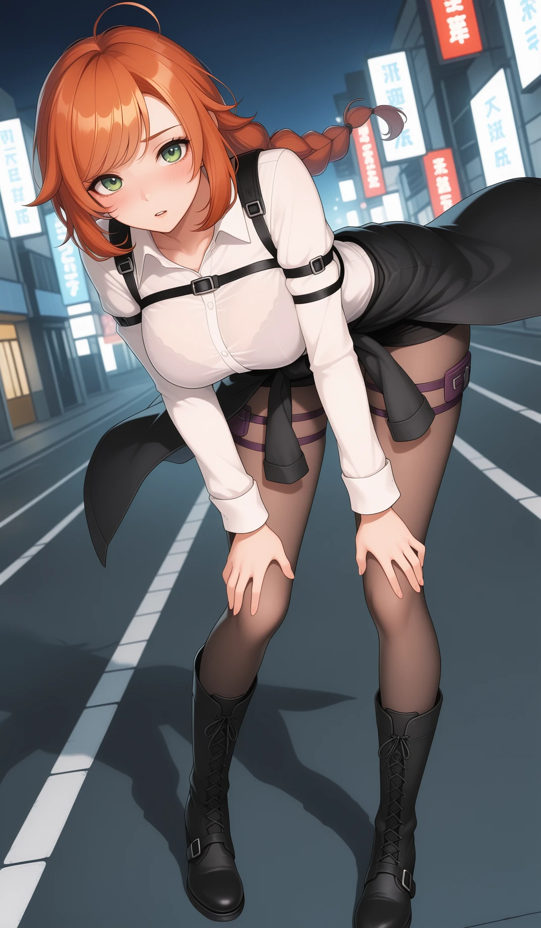 4. Additional prompts to specify character's appearance if necessery: green eyes, orange hair, ahoge, braided ponytail, single braid, bra visible through shirt, black boots, pantyhose, lace-up boots, black jacket around waist, long sleeves, multi-straps, arm straps, thigh straps, straps around breasts, taut shirt, shirt tucked in