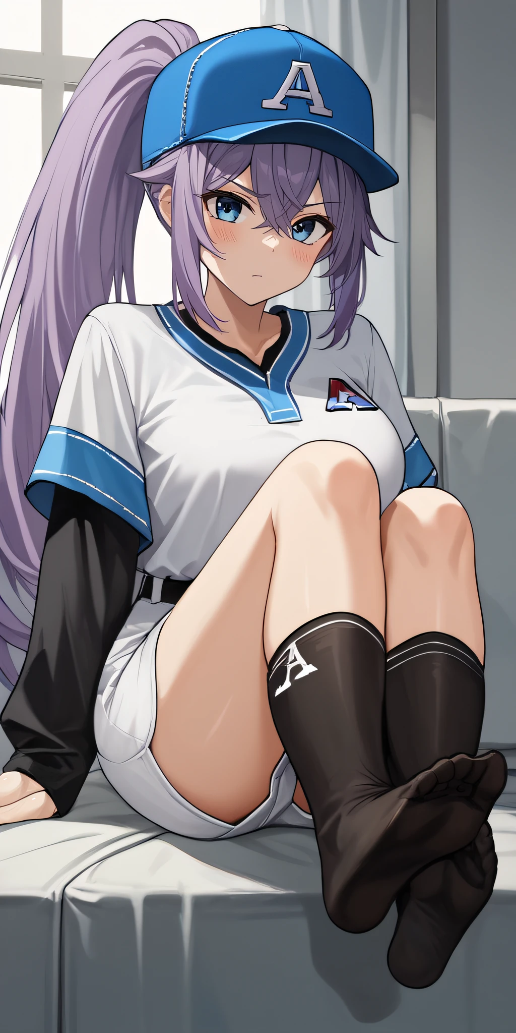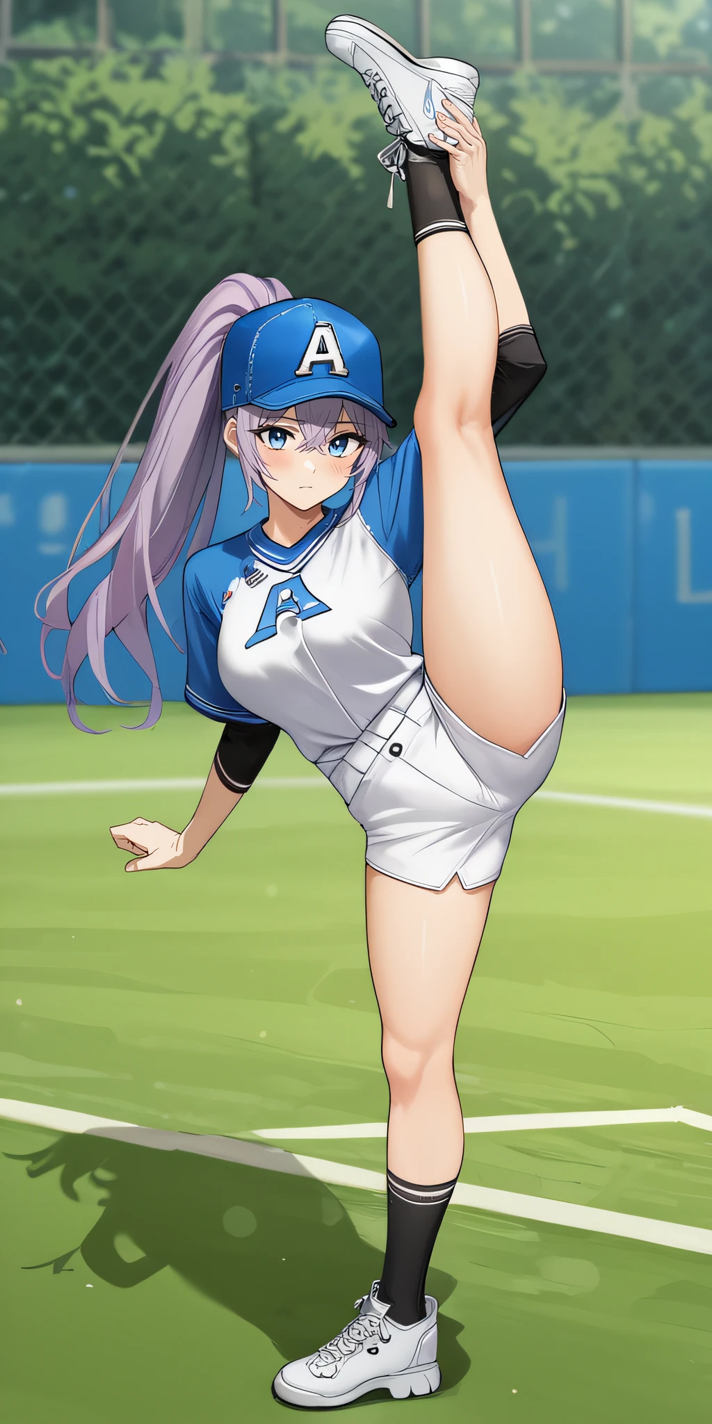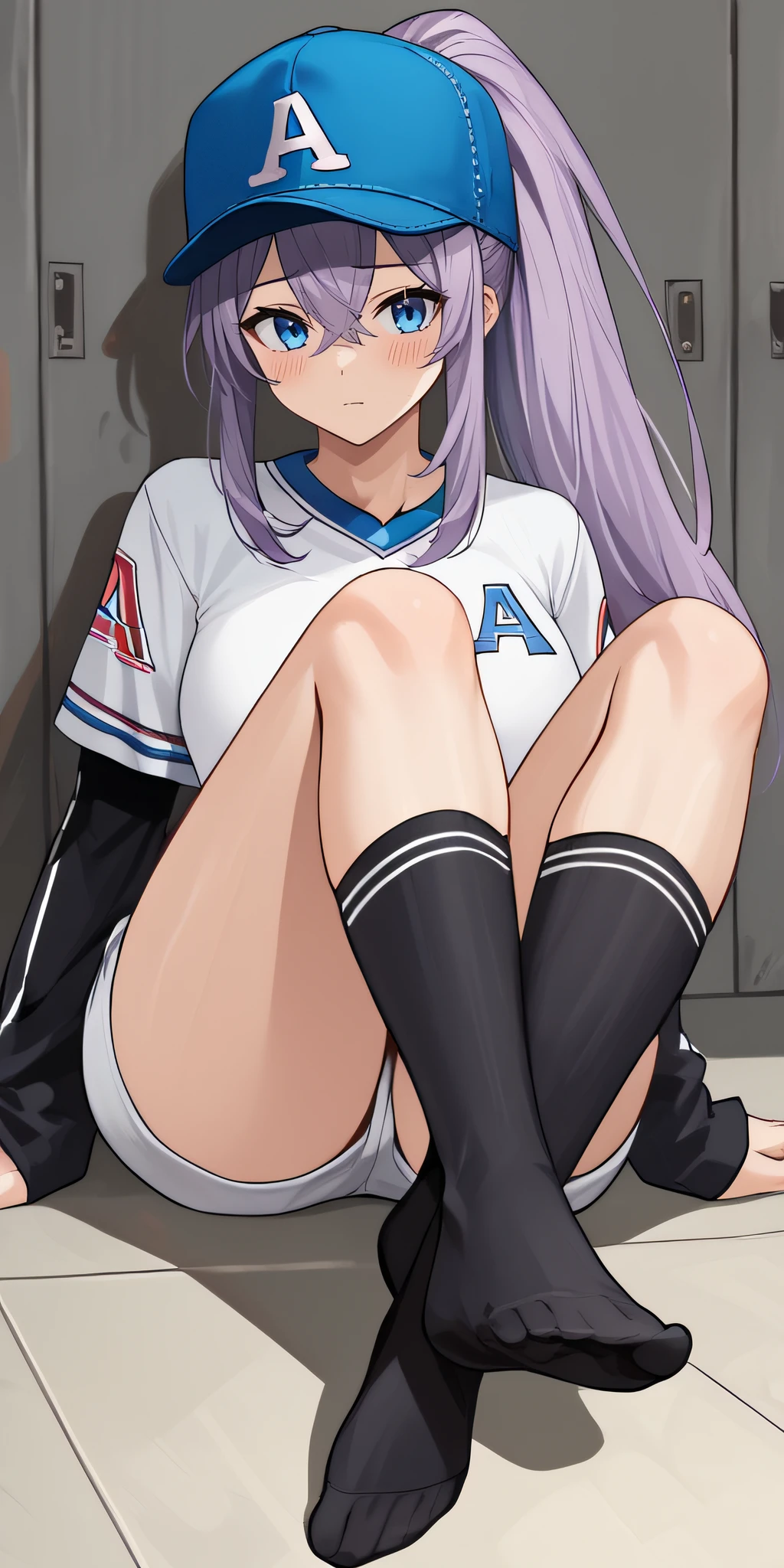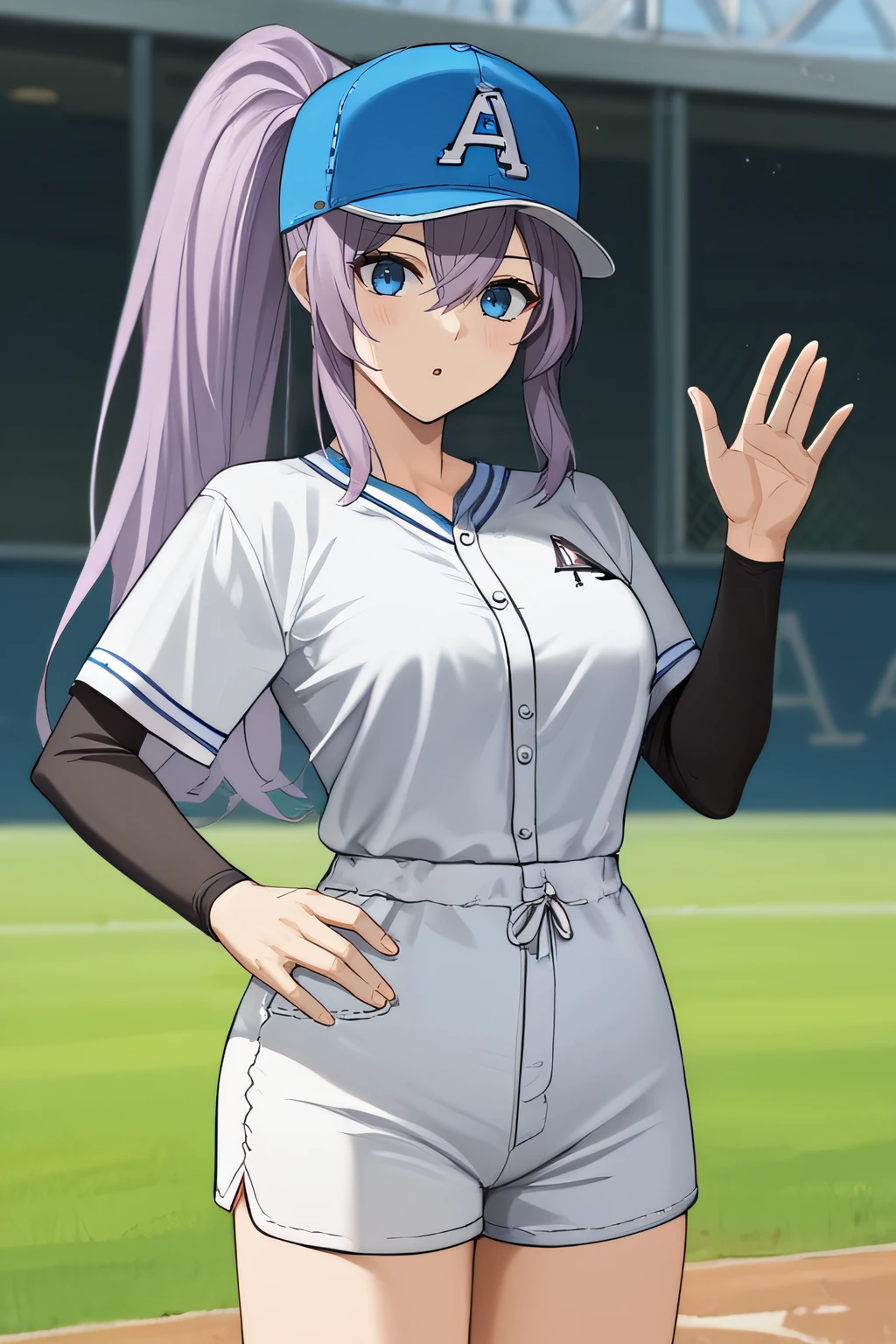 ponytail, purple hair, grey hair, two tone hair, blue eyes, large breasts, baseball uniform, blue baseball cap, white shirt, black layered sleeves, white shorts