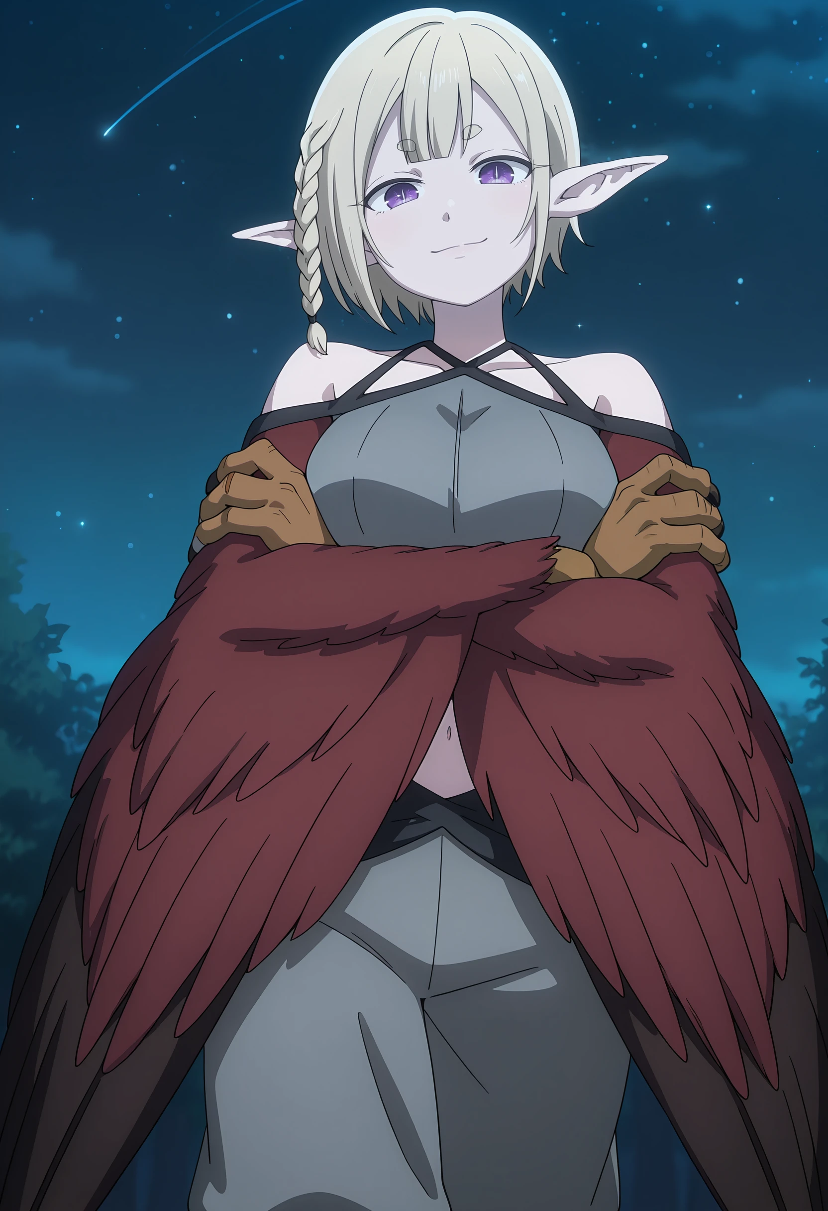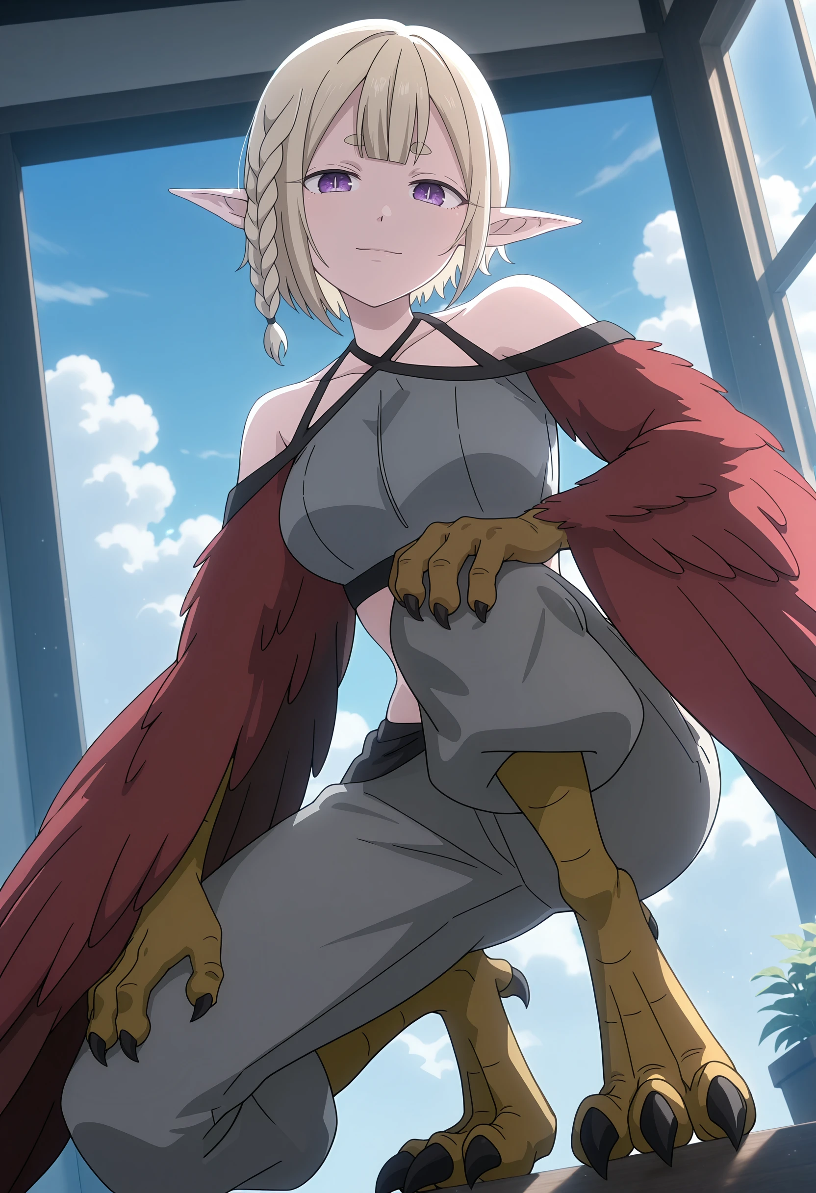 KizetsuHapi, monster girl, harpy, winged arms, feathered wings, red feathers, bird legs, talons, pointy ears, purple eyes, blonde hair, short hair, braided sidelock, blunt bangs