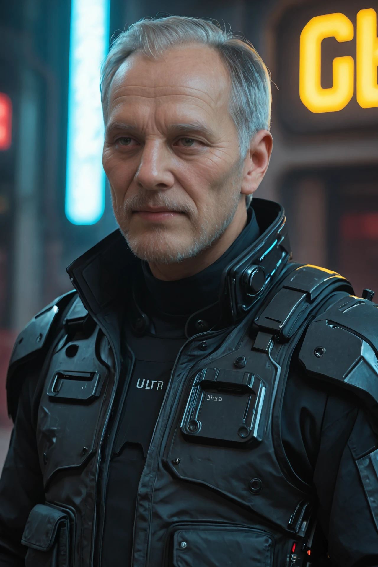 Gray short hair, stubble,