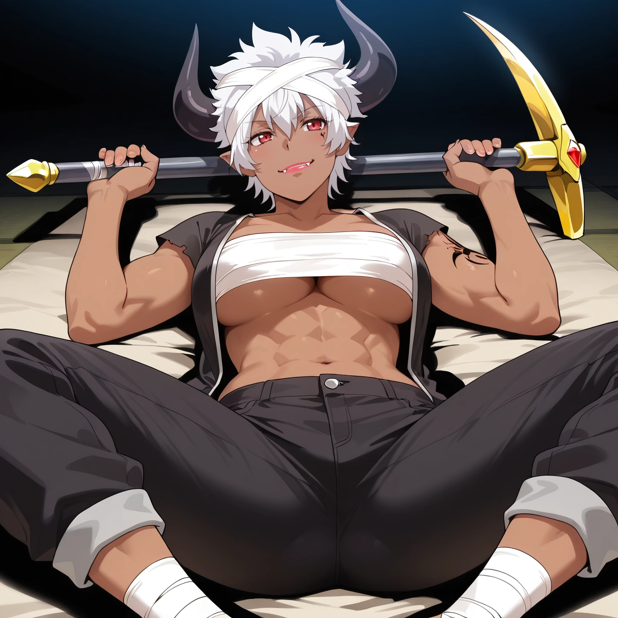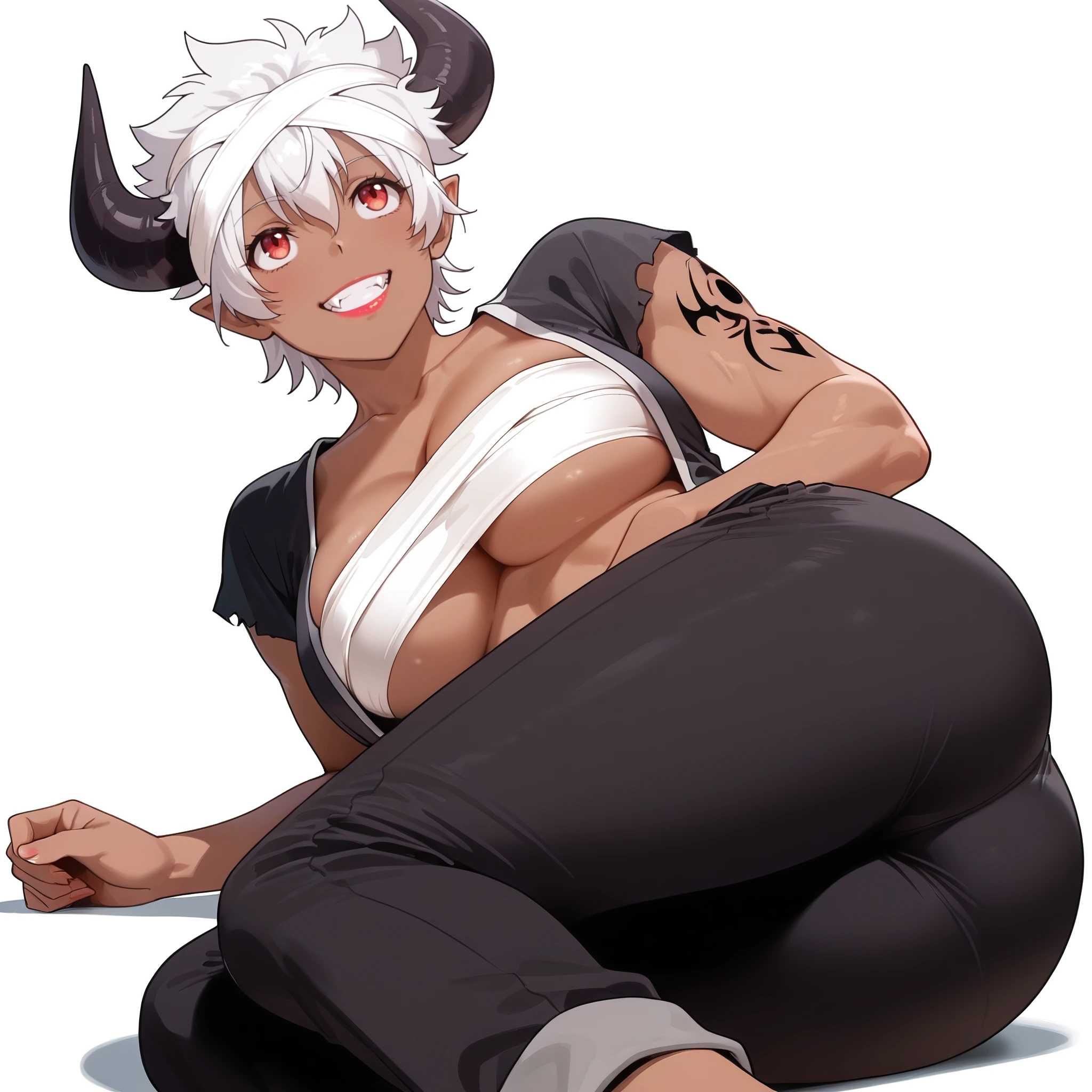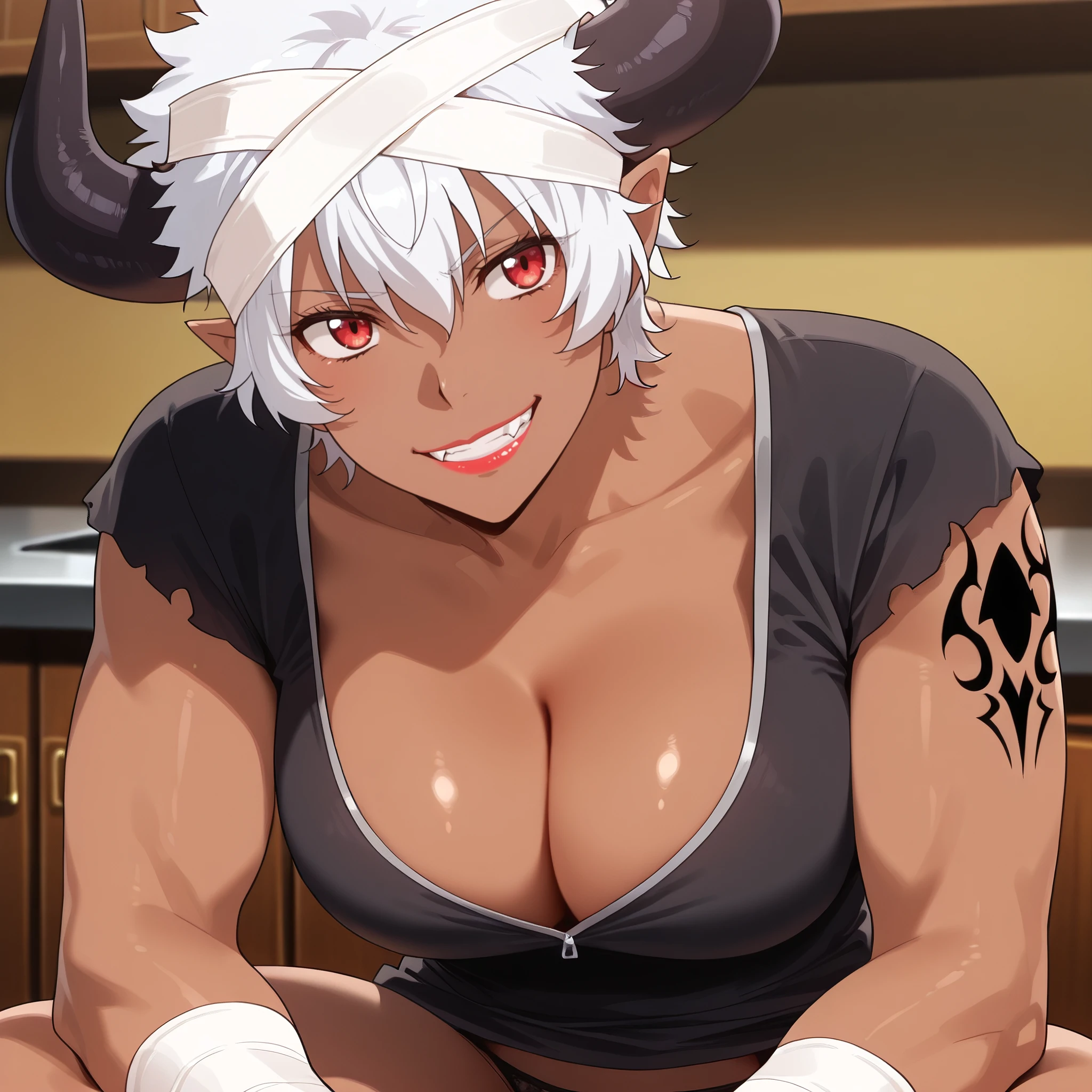 ReMonsterE, red eyes, white hair, short hair, fangs, dark-skinned female, dark skin, black horns, bandages, bandage headband, lipstick, pointy ears, tattoo, muscular,