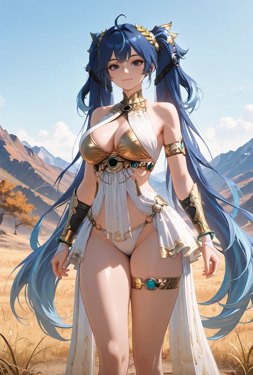 iuno, blue eyes, blue hair, ahoge, double-parted bangs, streaked hair, head wreath, twintails, hair belt, very long hair, white top, sling bikini top, gold bra, greco-roman clothes, gold accessories, armlet, arm guards, bracelet, showgirl skirt, white panties, thighlet,