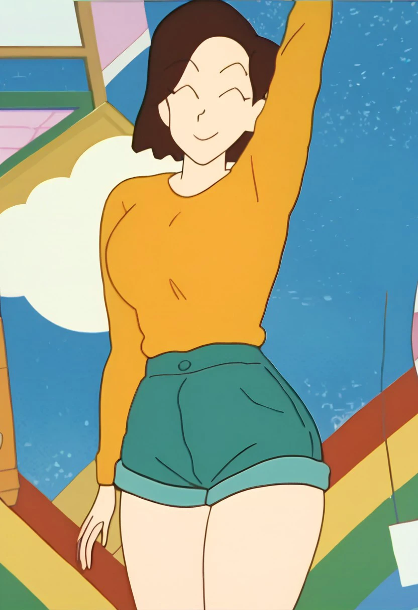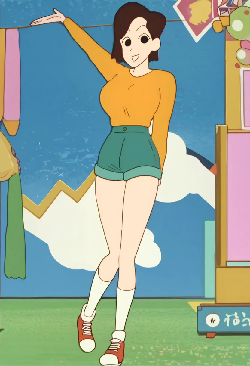 singing woman, brown hair, short hair, black eyes, black hair,