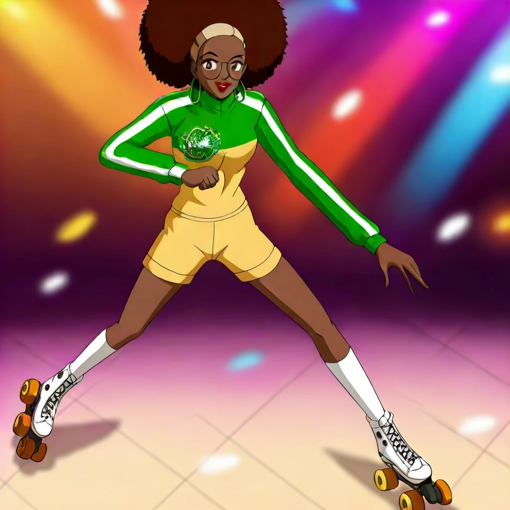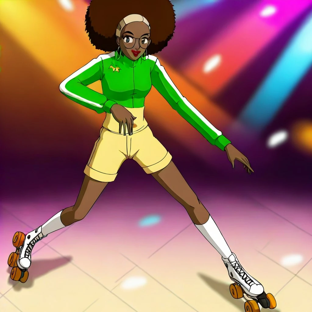 green sportjack, long sleeves, yellow shorts, white knee socks, roller skates,