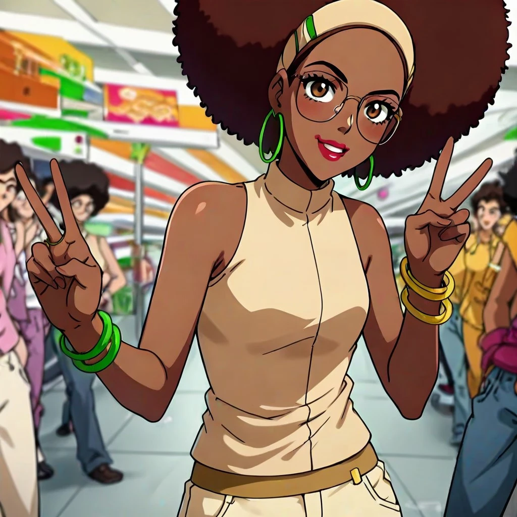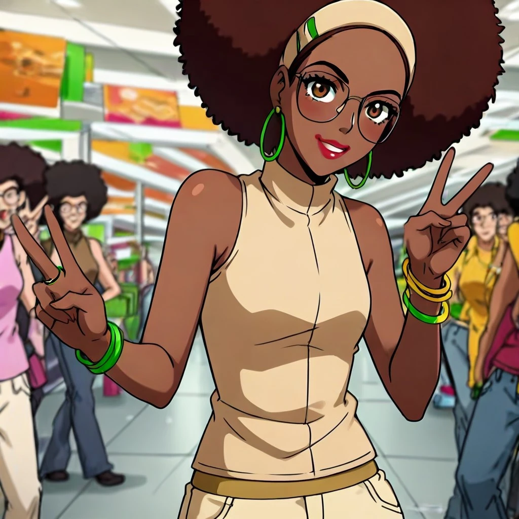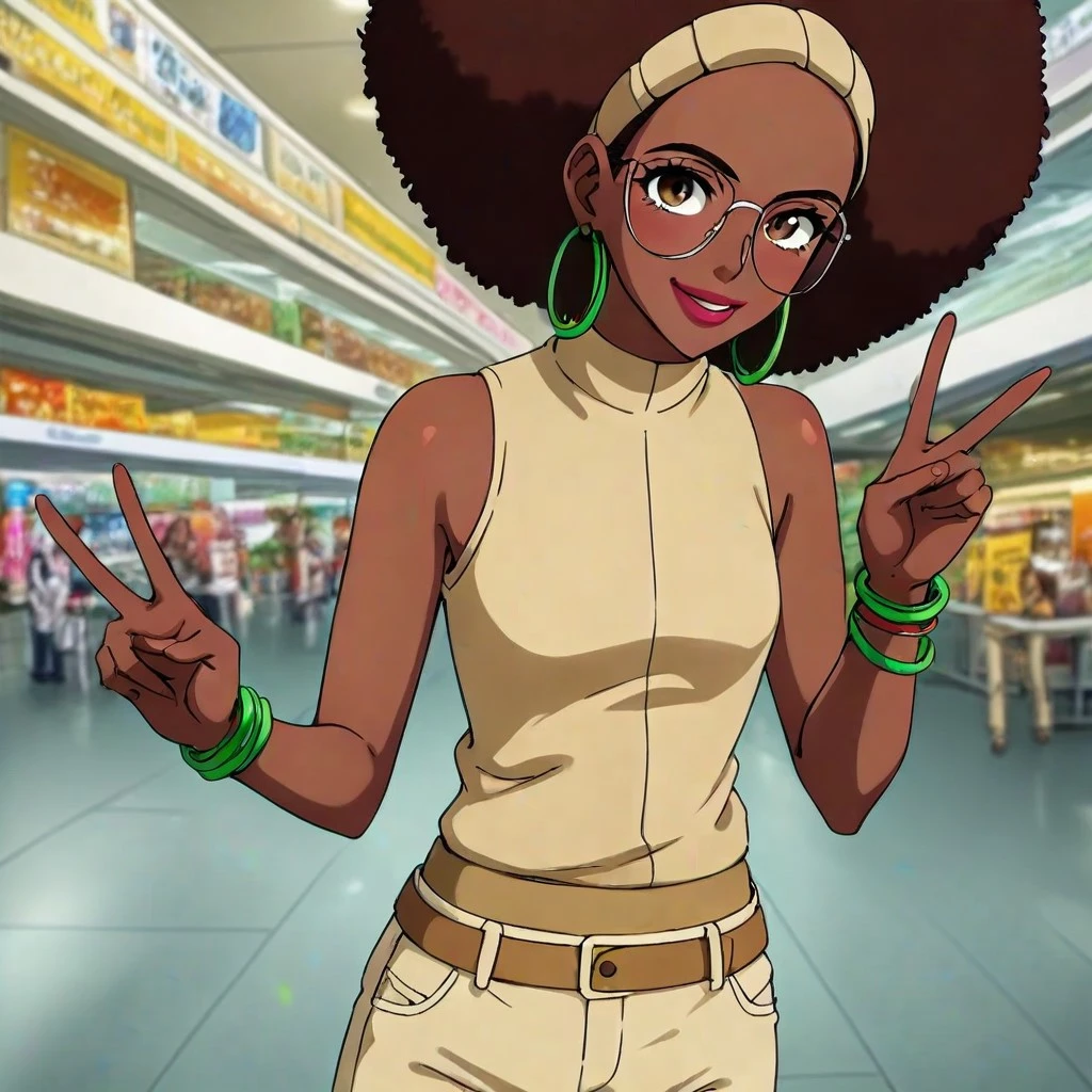 solo, 1girl, Marigold_ts, brown eyes, brown hair, afro, dark skinned female, lipstick,