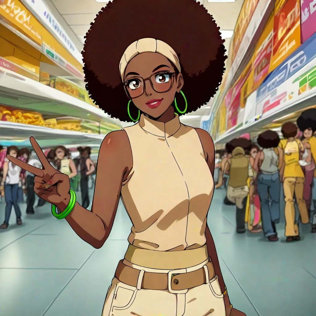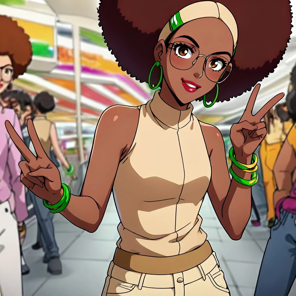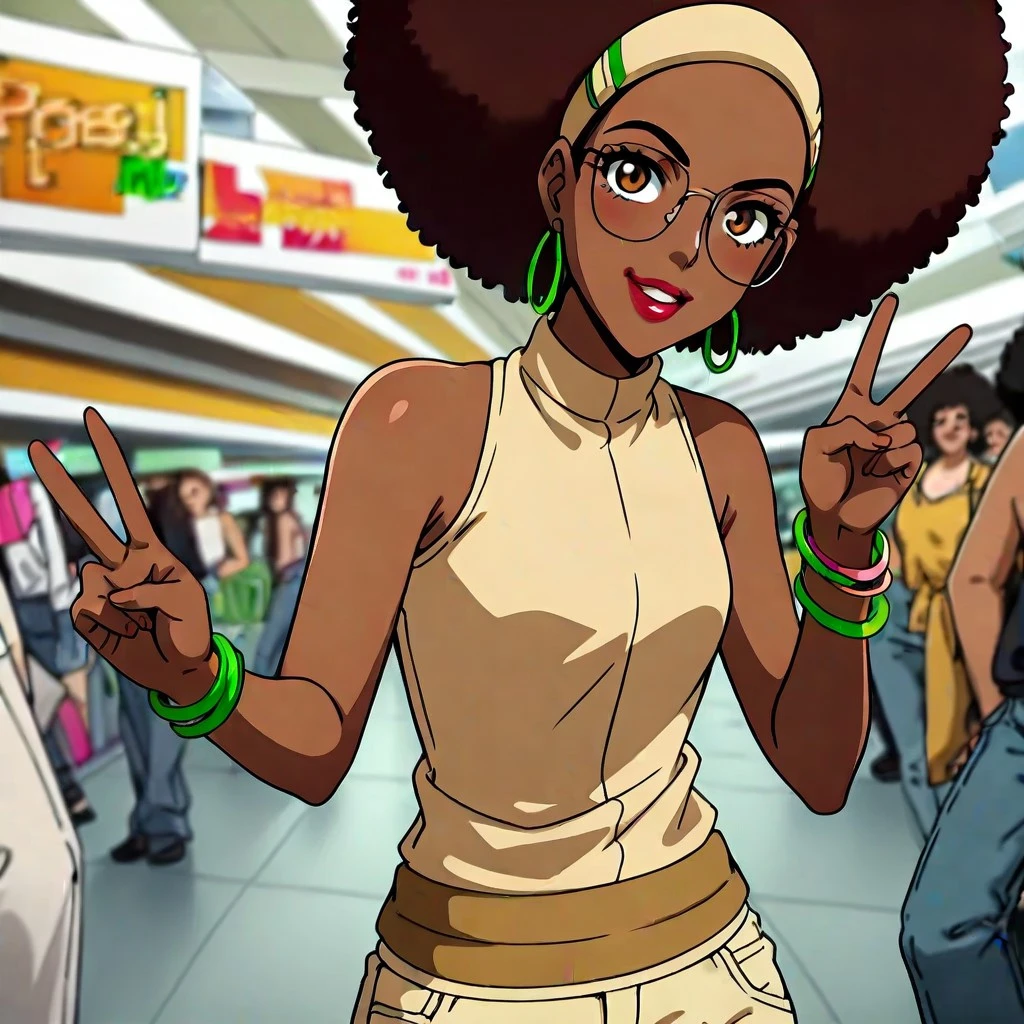 solo, 1girl, Marigold_ts, brown eyes, brown hair, afro, dark skinned female, lipstick,