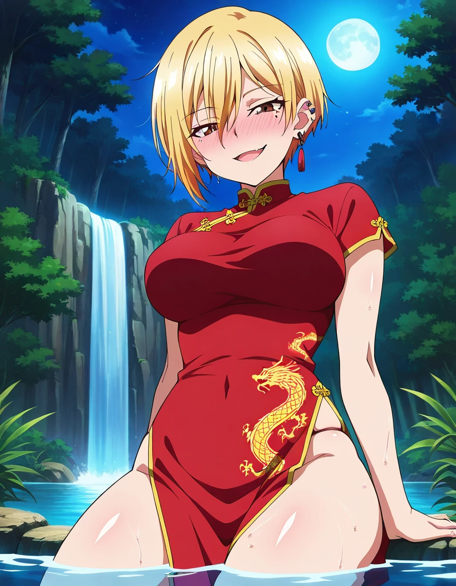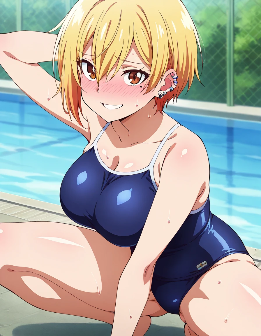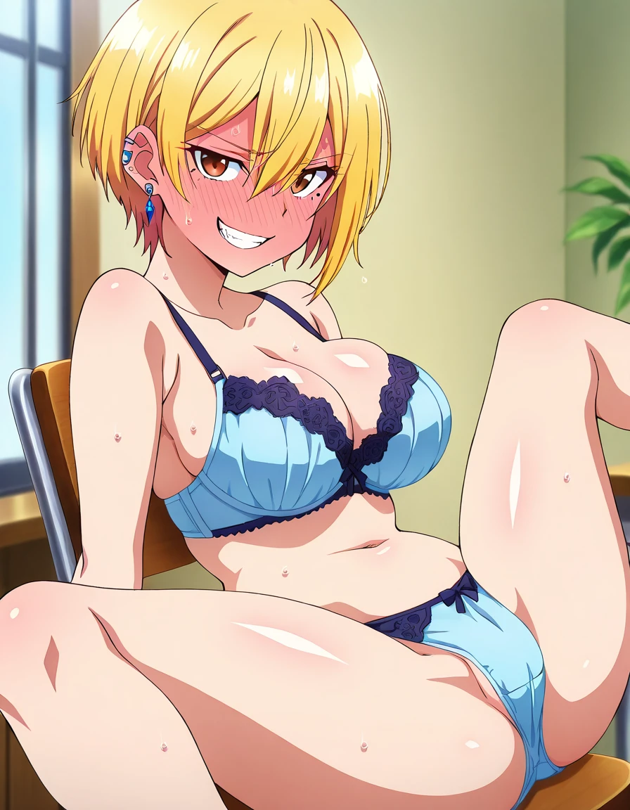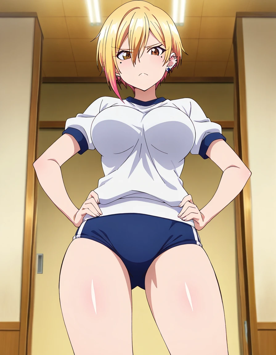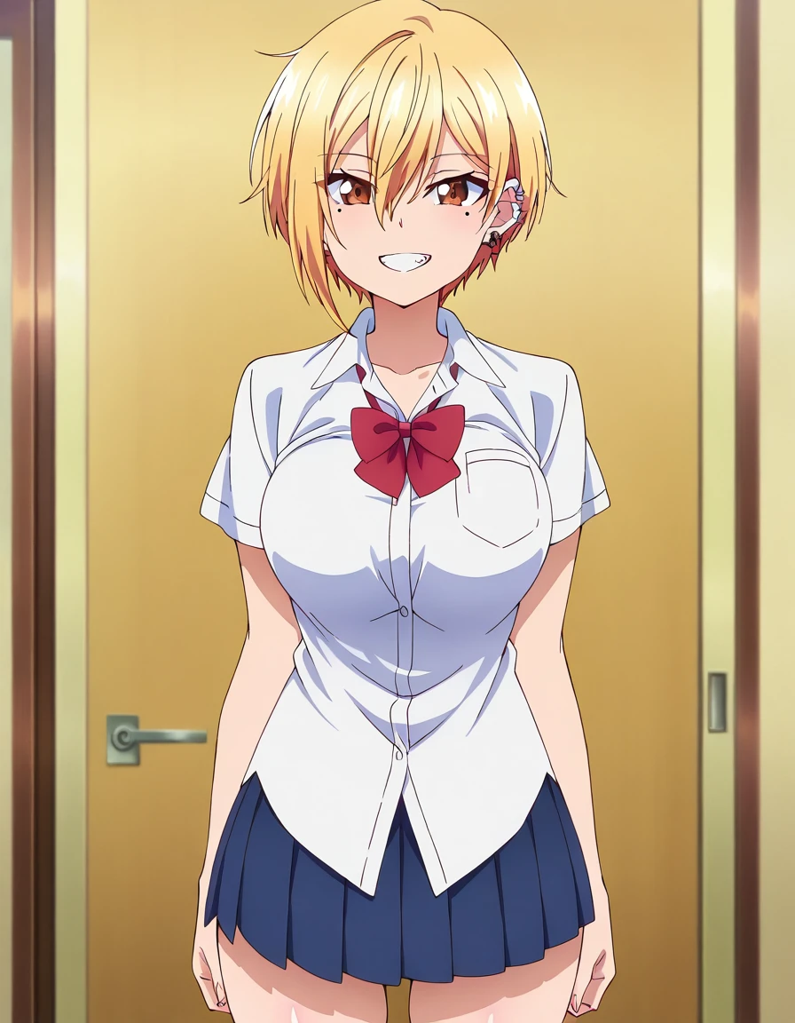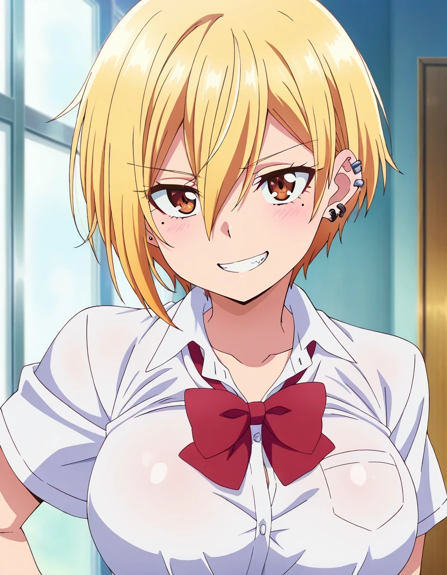kikkawa, brown eyes, blonde hair, short hair, hair between eyes, mole, mole under eye, large breasts, jewelry, earrings, piercing, ear piercing,