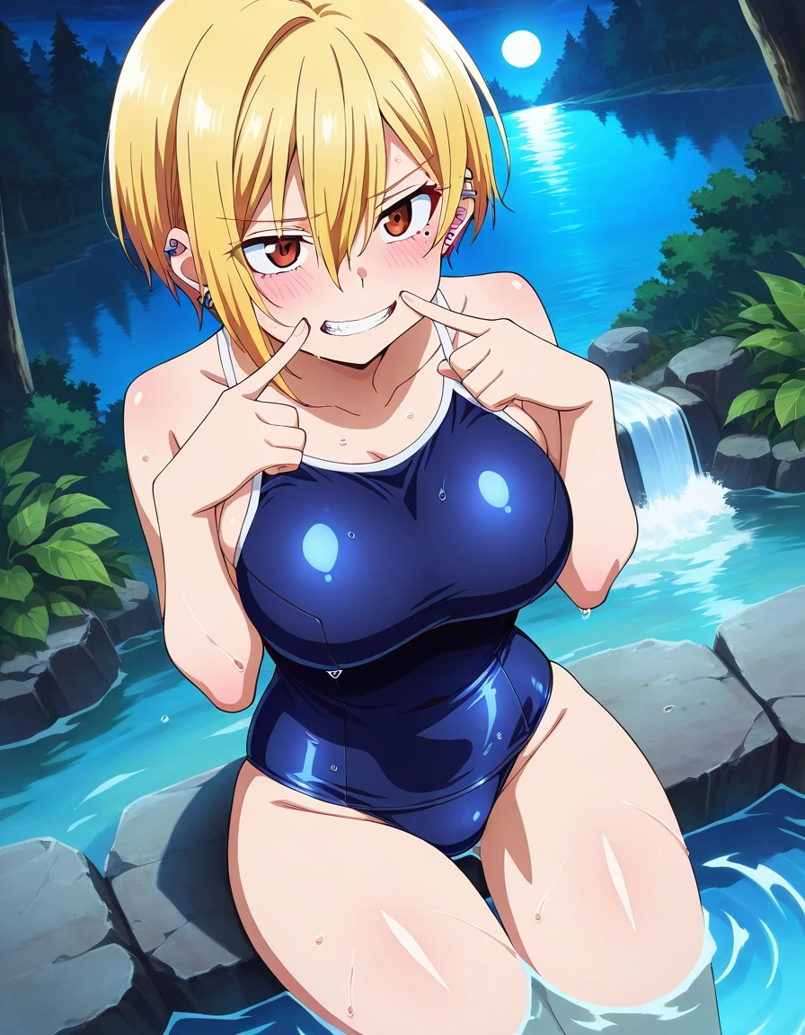 brown eyes, blonde hair, short hair, hair between eyes, mole, mole under eye, large breasts, jewelry, earrings, piercing, ear piercing,