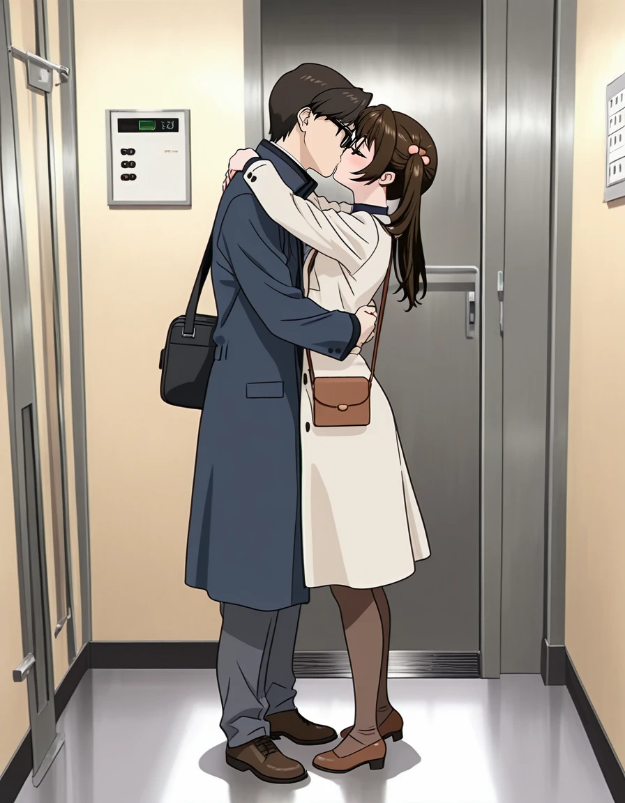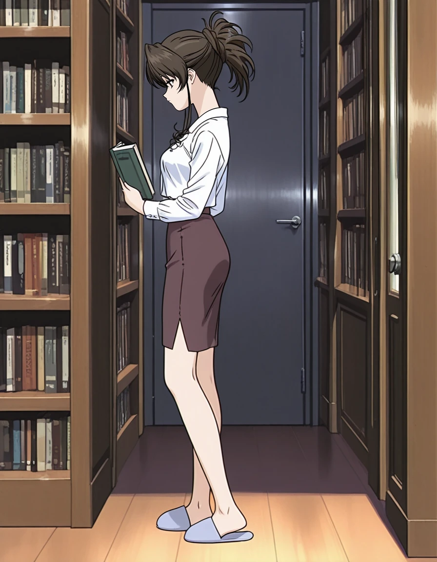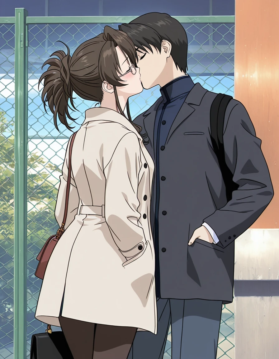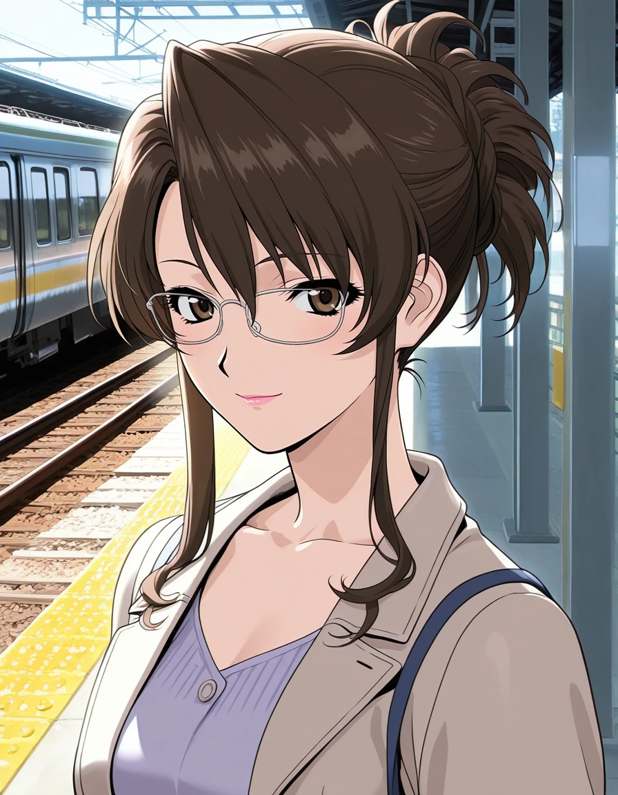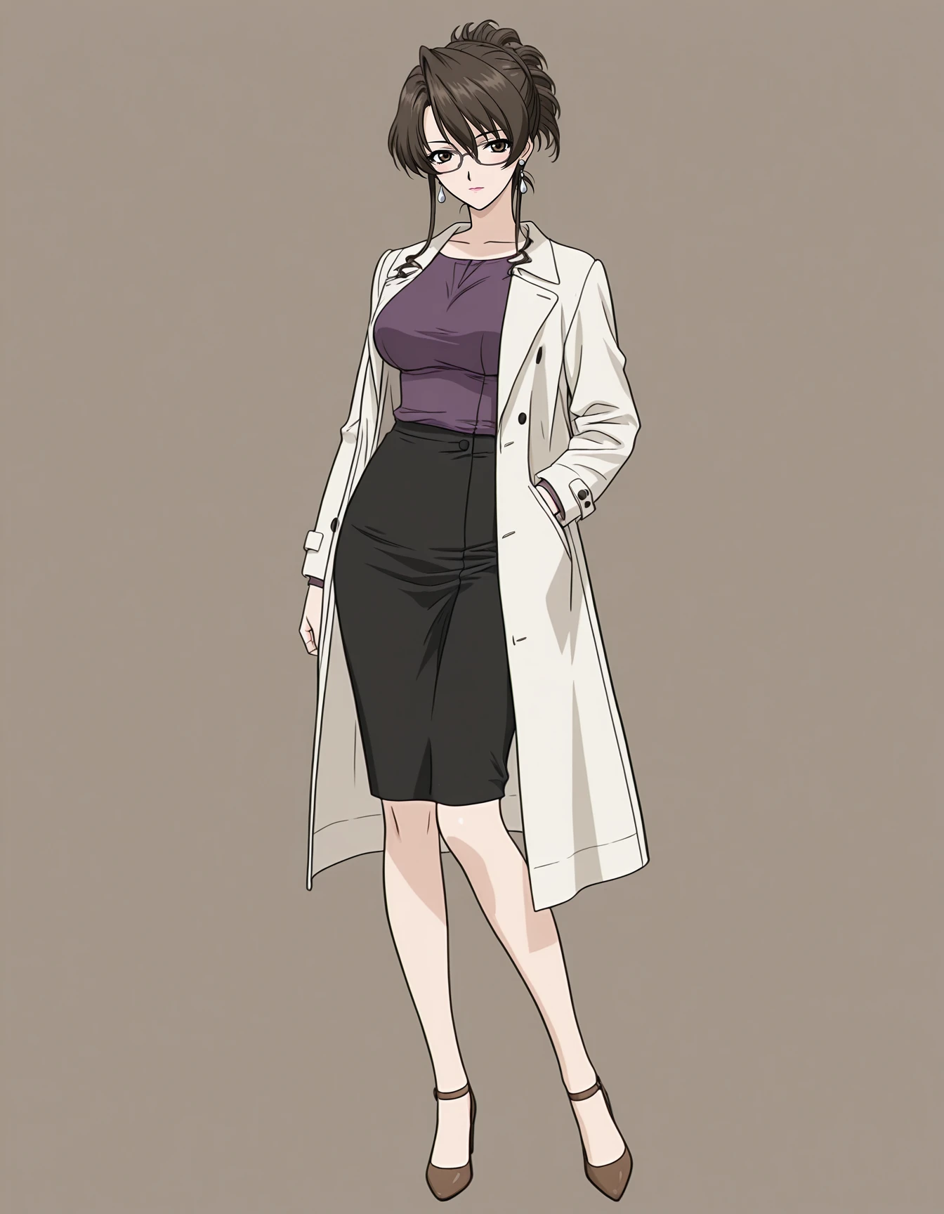 mai_himegoto,mai_hmgt_misaki,mature_female,hair_up,brown_hair,glasses,brown_eyes,lipstick,earrings,long_coat,open_clothes,purple_shirt,black_pencil_skirt,brown_high_heels
